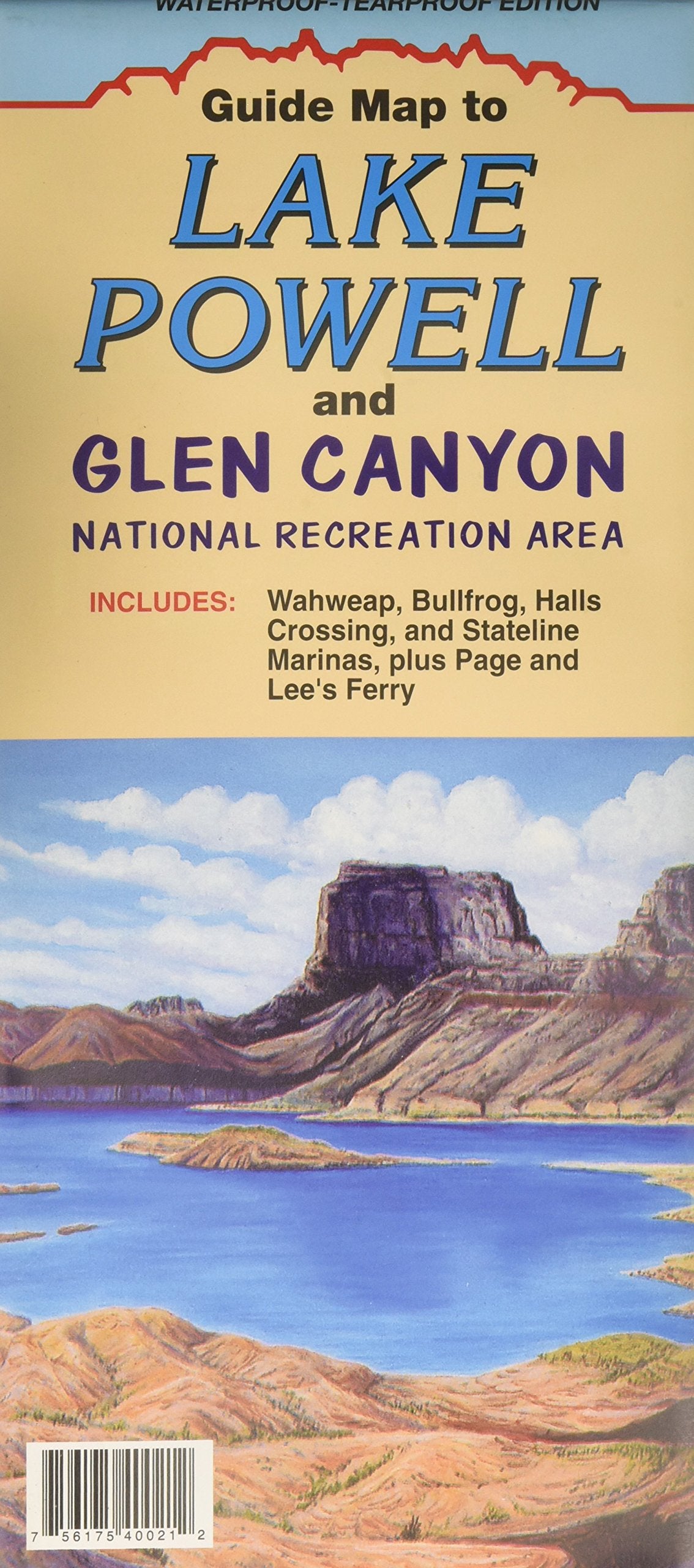 Folded, topographic guide map to Lake Powell and Glen Canyon National Recreation Areas, Arizona/Utah. Lake Powell is on one side of map; Glen Canyon on the reverse. Includes Wahweap, Bullfrog, Halls Crossing, stateline marinas, Page and Lee's Ferry. Printed on waterproof/tearproof material.