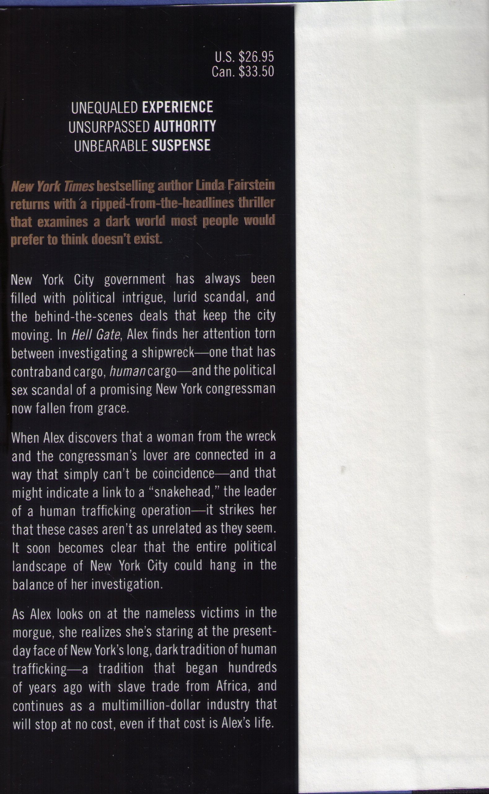 Head Of The Sex Crimes Unit Of The District Attorneys Office In Manhattan For Decades, Linda Fairstein Is Americas Most Visible Legal Expert On Sexual Assault And Domestic Violencewhich Is Why She Writes Some Of The Most Compelling Crime Thrillers Of Our Time And Why Her Alexandra Cooper Series Has Been Topping Bestseller List For More Than A Decade. Fans Turn To Fairstein For Rippedfromtheheadline Crimes, Cuttingedge Investigations, And Vindication For Victims. Linda Fairstein Brings Readers Inside A World Of Which They Cant Get Enough, But One They Hope To Never See In Real Life.And For Her Twelfth Novel, Fairstein Takes Alexandra Cooper Inside A World Shed Rather Not See.New York City Politics Have Always Been Filled With Intrigue And Behindthescenes Deals. In Hell Gate, Alex Finds Her Attention Torn Between Investigating A Shipwreck That Has Contraband Cargohuman Cargoand The Political Sex Scandal Of A Promising New York Congressman Now Fallen From Grace. When Alex Discovers That A Woman From The Wreck And The Congressmans Lover Have The Same Rose Tattoothe Brand Of A 'Snakehead', A Master Of A Human Trafficking Operationit Dawns On Her That These Cases Arent As Unrelated As They Seem And That The Entire Political Landscape Of New York City Could Hang In The Balance Of Her Investigation. As Alex Looks On At The Nameless Victims In The Morgue, She Realizes Shes Looking At The Presentday Face Of New Yorks Long, Dark Tradition Of Human Traffickinga Tradition That Began Hundreds Of Years Ago With Slave Trade From Africa, Now A Multimilliondollar Industry That Will Stop At No Cost, Even If That Cost Is Alexs Life.Watch A Video