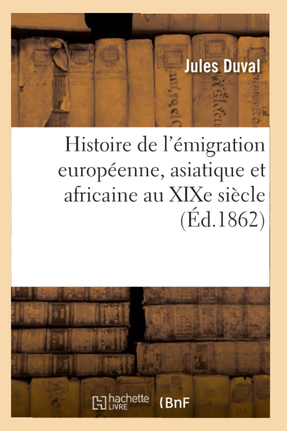 Histoire de l'migration europenne, asiatique et africaine au XIXe sicle: ses causes, ses caractres, ses effets / par M. Jules Duval, ...Date de l'dition originale: 1862Le prsent ouvrage s'inscrit dans une politique de conservation patrimoniale des ouvrages de la littrature Franaise mise en place avec la BNF.HACHETTE LIVRE et la BNF proposent ainsi un catalogue de titres indisponibles, la BNF ayant numris ces oeuvres et HACHETTE LIVRE les imprimant la demande.Certains de ces ouvrages refltent des courants de pense caractristiques de leur poque, mais qui seraient aujourd'hui jugs condamnables.Ils n'en appartiennent pas moins l'histoire des ides en France et sont susceptibles de prsenter un intrt scientifique ou historique.Le sens de notre dmarche ditoriale consiste ainsi permettre l'accs ces oeuvres sans pour autant que nous en cautionnions en aucune faon le contenu.Pour plus d'informations, rendezvous sur www.hachettebnf.fr