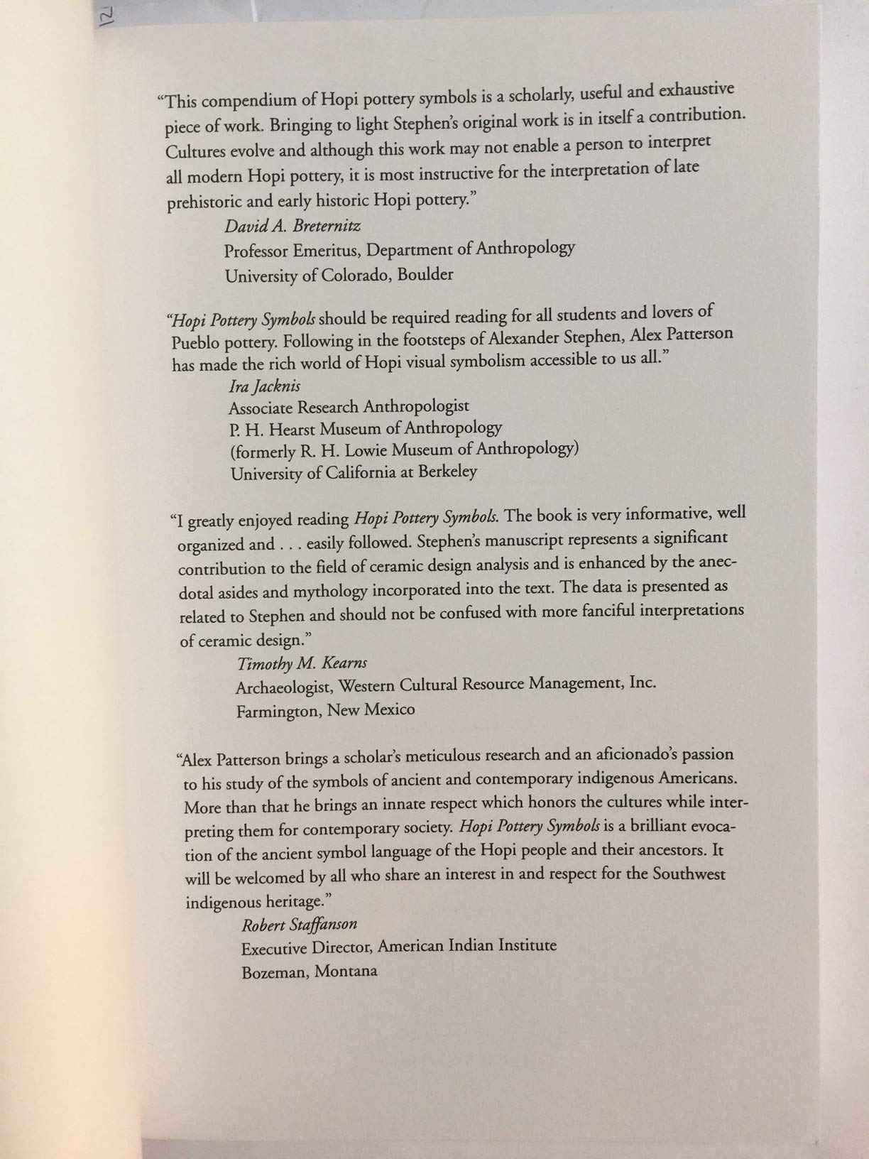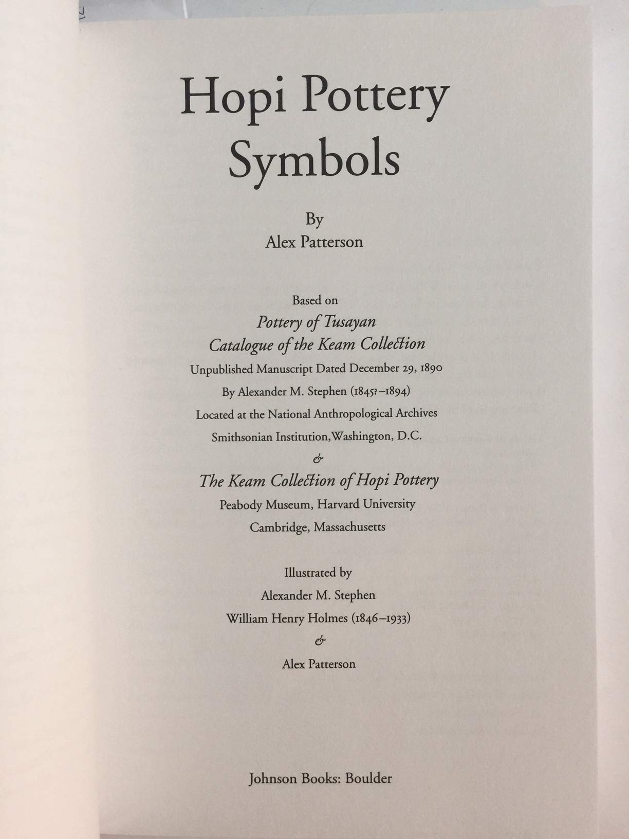 Alexander M. Stephen, a selftaught anthropologist and an associate of Indian trader Thomas Keam, lived among the Hopi during the late nineteenth century. Having excellent rapport with the tribal elders, Stephen asked them the meaning of symbols on the pots he was collecting for Keam and recorded these interpretations in a catalogue entitled 'Pottery of Tusayan: Catalogue of the Keam Collection.' This manuscript is printed here in its entirety for the first time and is illustrated from the Keam Collection, which is now housed at the Peabody Museum, Harvard University. Alex Patterson then incorporates Stephens interpretations and cultural stories into a unique alphabetically arranged guide to the eightyfour symbols on the collected pots.