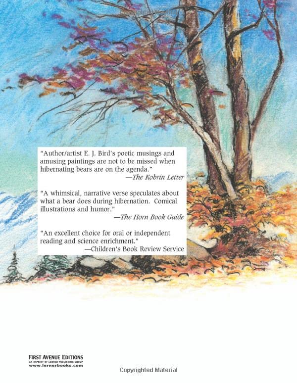 Artist and storyteller E. J. Bird describes the habits of hibernating bears in this endearing rhymed picture book. Children will wonder along with the author if bears dream, how bears stay warm, and if they toss and turn.