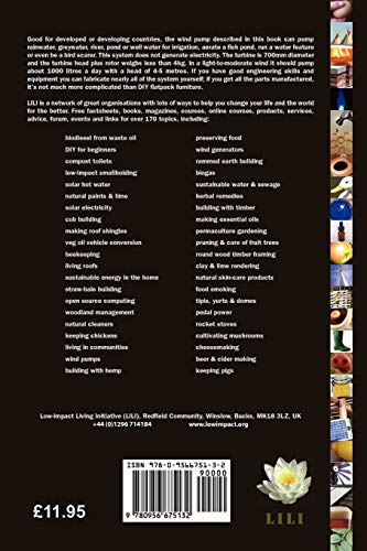 Good for developed or developing countries, the wind pump described in this book can pump rainwater, greywater, river, pond or well water for irrigation, aerate a fish pond, run a water feature or even be a bird scarer. This system does not generate electricity. The turbine is 700mm diameter and the turbine head plus rotor weighs less than 4kg. In a lighttomoderate wind it should pump about 1000 litres a day with a head of 45 metres. If you have good engineering skills and equipment you can fabricate nearly all of the system yourself; if you get all the parts manufactured, it's not much more complicated than DIY flatpack furniture.
