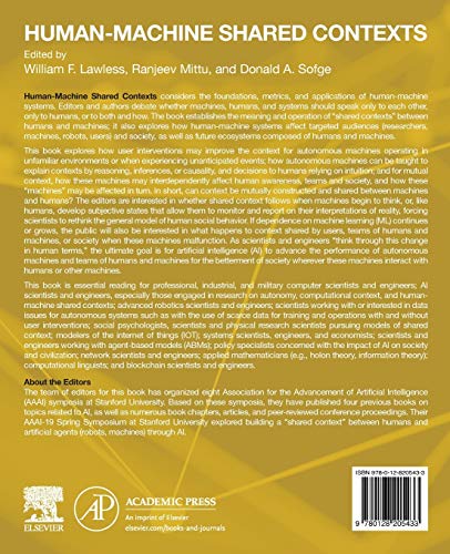 HumanMachine Shared Contexts considers the foundations, metrics, and applications of humanmachine systems. Editors and authors debate whether machines, humans, and systems should speak only to each other, only to humans, or to both and how. The book establishes the meaning and operation of shared contexts between humans and machines; it also explores how humanmachine systems affect targeted audiences (researchers, machines, robots, users) and society, as well as future ecosystems composed of humans and machines.This book explores how user interventions may improve the context for autonomous machines operating in unfamiliar environments or when experiencing unanticipated events; how autonomous machines can be taught to explain contexts by reasoning, inferences, or causality, and decisions to humans relying on intuition; and for mutual context, how these machines may interdependently affect human awareness, teams and society, and how these "machines" may be affected in turn. In short, can context be mutually constructed and shared between machines and humans? The editors are interested in whether shared context follows when machines begin to think, or, like humans, develop subjective states that allow them to monitor and report on their interpretations of reality, forcing scientists to rethink the general model of human social behavior. If dependence on machine learning continues or grows, the public will also be interested in what happens to context shared by users, teams of humans and machines, or society when these machines malfunction. As scientists and engineers "think through this change in human terms," the ultimate goal is for AI to advance the performance of autonomous machines and teams of humans and machines for the betterment of society wherever these machines interact with humans or other machines.This book will be essential reading for professional, industrial, and military computer scientists and engineers; machine learning (ML) and artificial intelligence (AI) scientists and engineers, especially those engaged in research on autonomy, computational context, and humanmachine shared contexts; advanced robotics scientists and engineers; scientists working with or interested in data issues for autonomous systems such as with the use of scarce data for training and operations with and without user interventions; social psychologists, scientists and physical research scientists pursuing models of shared context; modelers of the internet of things (IOT); systems of systems scientists and engineers and economists; scientists and engineers working with agentbased models (ABMs); policy specialists concerned with the impact of AI and ML on society and civilization; network scientists and engineers; applied mathematicians (e.g., holon theory, information theory); computational linguists; and blockchain scientists and engineers. Discusses the foundations, metrics, and applications of humanmachine systems Considers advances and challenges in the performance of autonomous machines and teams of humans Debates theoretical humanmachine ecosystem models and what happens when machines malfunction