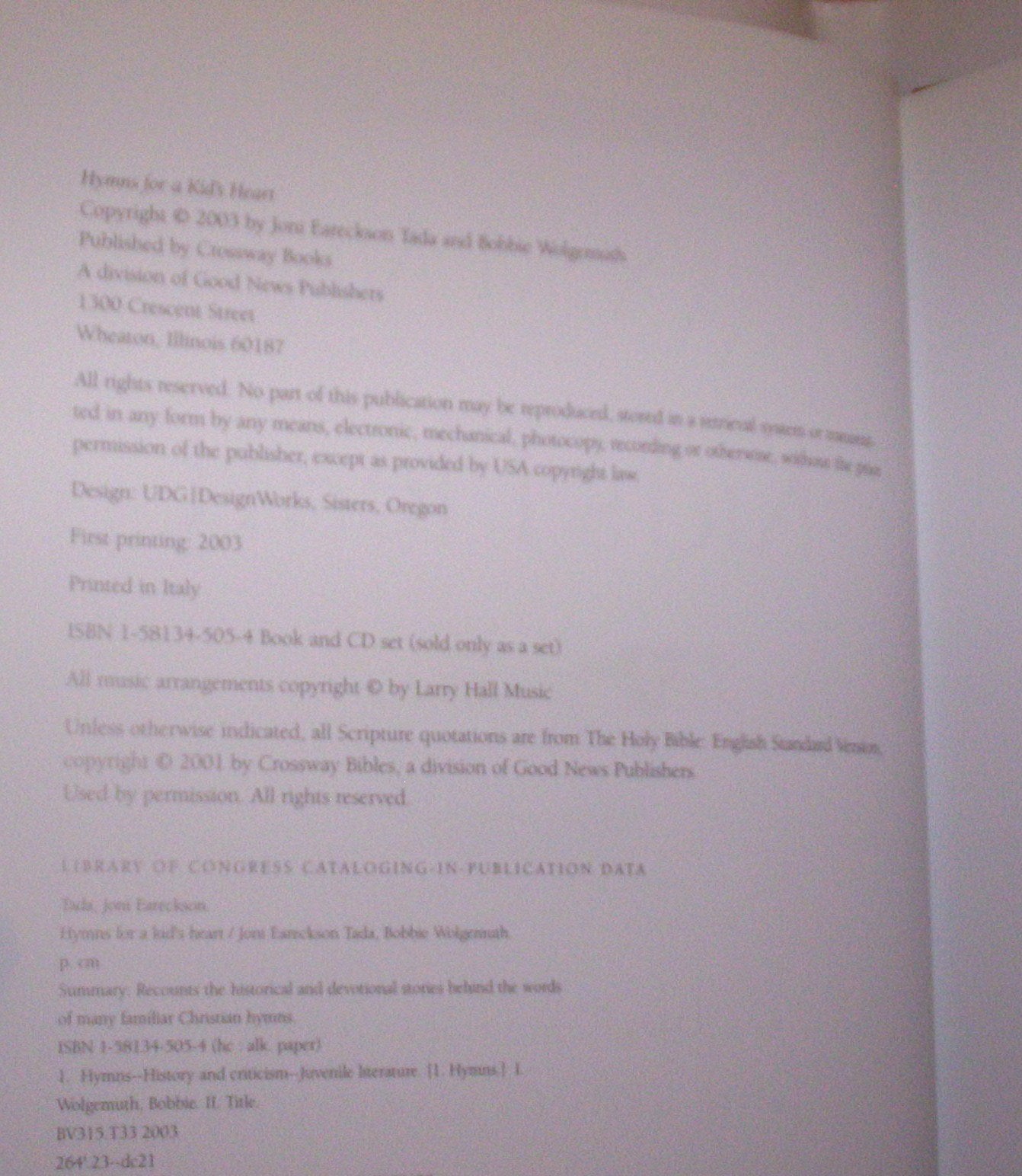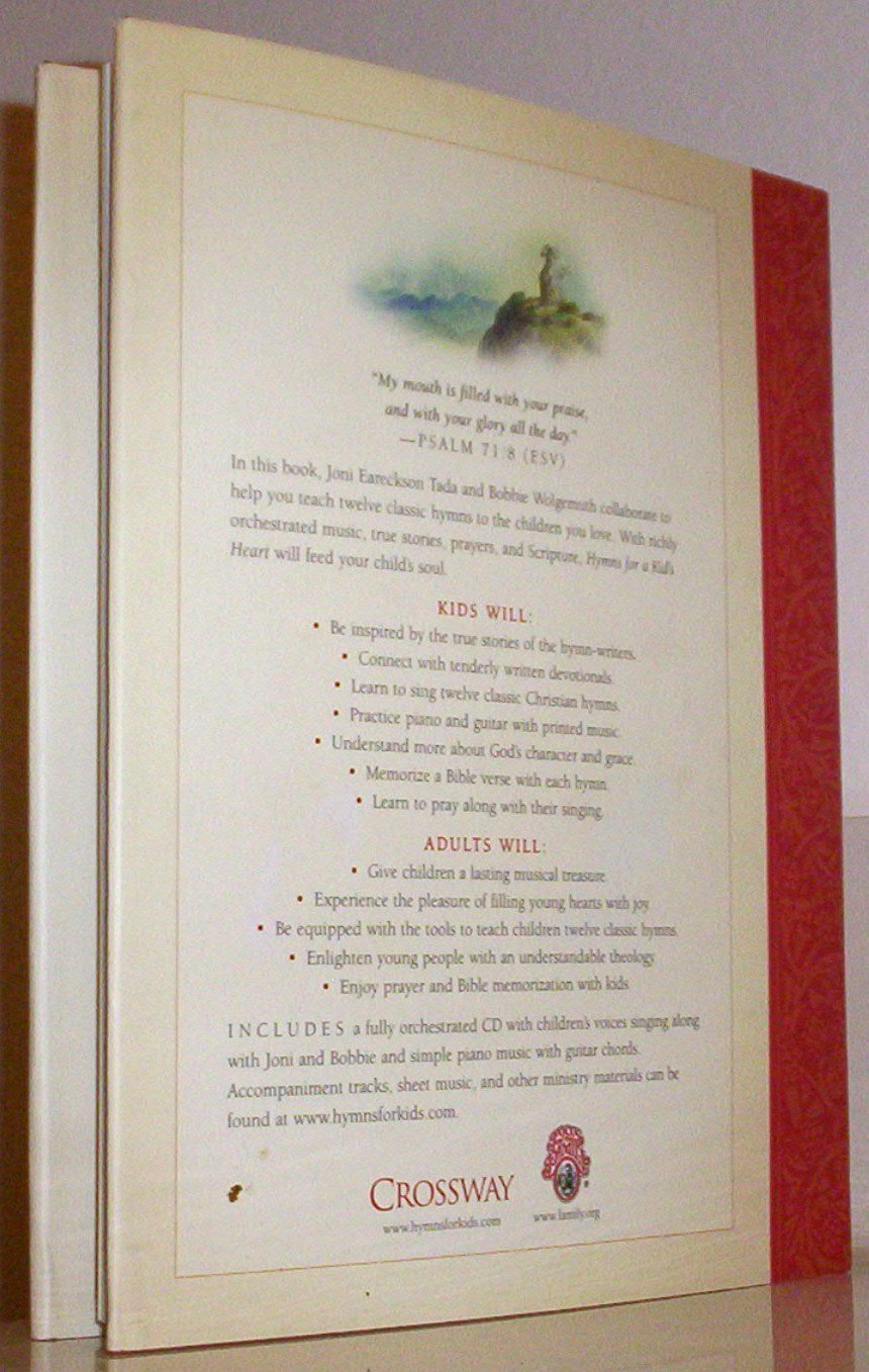 My mouth is filled with your praise, and with your glory all the day.' Psalm 71:8 (ESV)In this book, Joni Eareckson Tada and Bobbie Wolgemuth collaborate to help you teach twelve classic hymns to the children you love. With richly orchestrated music, true stories, prayers, and Scripture, Hymns for a Kid's Heart will feed your child's soul.KIDS WILL: Be inspired by the true stories of the hymnwriters. Connect with tenderly written devotionals. Learn to sing twelve classic Christian hymns. Practice piano and guitar with printed music. Understand more about God's character and grace. Memorize a Bible verse with each hymn. Learn to pray along with their singing.ADULTS WILL: Give children a lasting musical treasure. Experience the pleasure of filling young hearts with joy. Be equipped with the tools to teach children twelve classic hymns. Enlighten young people with an understandable theology. Enjoy prayer and Bible memorization with kids.Includes a fully orchestrated CD with children's voices singing along with Joni and Bobbie and simple piano music with guitar chords.Listen to 30second excerpts from the CDHoly, Holy, Holy! A Mighty Fortress Is Our God This Is My Father's World O for a Thousand Tongues to Sing (full song) How Firm a Foundation Amazing Grace! The Lord's My Shepherd, I'll Not Want Rejoice, Ye Pure in Heart Take My Life, and Let It Be America the Beautiful Our God, Our Help in Ages Past Eternal Father, Strong to SaveProblems? Download the newest version of Windows Media Player free.