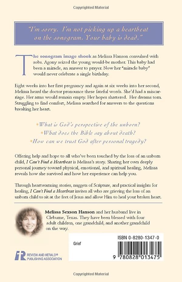 "I'm sorry. I'm not picking up a heartbeat on the sonogram. Your baby is dead."The sonogram image shook as Melissa Hanson convulsed with sobs. Agony seized the young wouldbe mother. This baby had been a miracle, an answer to prayer. Now her miracle baby would never celebrate a single birthday.Eight weeks into her first pregnancy and again at six weeks into her second, Melissa heard the doctor pronounce these fateful words. Shed had a miscarriage. Her arms would remain empty. Her hopes shattered. Her dreams torn. Struggling to find comfort, Melissa searched for answers to the questions breaking her heart. What is God's perspective of the unborn? What does the Bible say about death? How can we trust God after personal tragedy? Offering help and hope to all whove been touched by the loss of an unborn child, I Cant Find a Heartbeat is Melissas story. Sharing her own deeply personal journey toward physical, emotional, and spiritual healing, Melissa reveals how she survived and how her experience can help you.Through heartwarming stories, nuggets of Scripture, and practical insights for healing, I Cant Find a Heartbeat invites all who are grieving the loss of an unborn child to sit at the feet of Jesus and allow Him to heal your broken heart.
