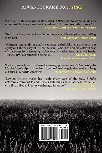 "I never set out to hike 10,000 miles. It just sort of happened over the course of a decade." And so goes Lawton Grinter's compelling collection of short stories that have been over ten years and 10,000 trail miles in the making. I Hike brings the reader trailside with blissful moments on the highest mountain ridges to the mental lows of mosquito hell and into some peculiar situations that even seasoned hikers may find unbelievable.Between jobs and in search of something more, Lawton Grinter spent the better part of a decade hiking America's longest trails. In doing so he came face to face with things that go bump in the night, the kindness of strangers, a close encounter with hypothermia and the absurd rights of passage common to the eccentric people that call themselves longdistance hikers.Anyone who's ever stepped off the pavement will appreciate these humorous and sometimes agonizing accounts of trail life. I Hike will make you laugh, cry, cringe and leave you wanting to read more!