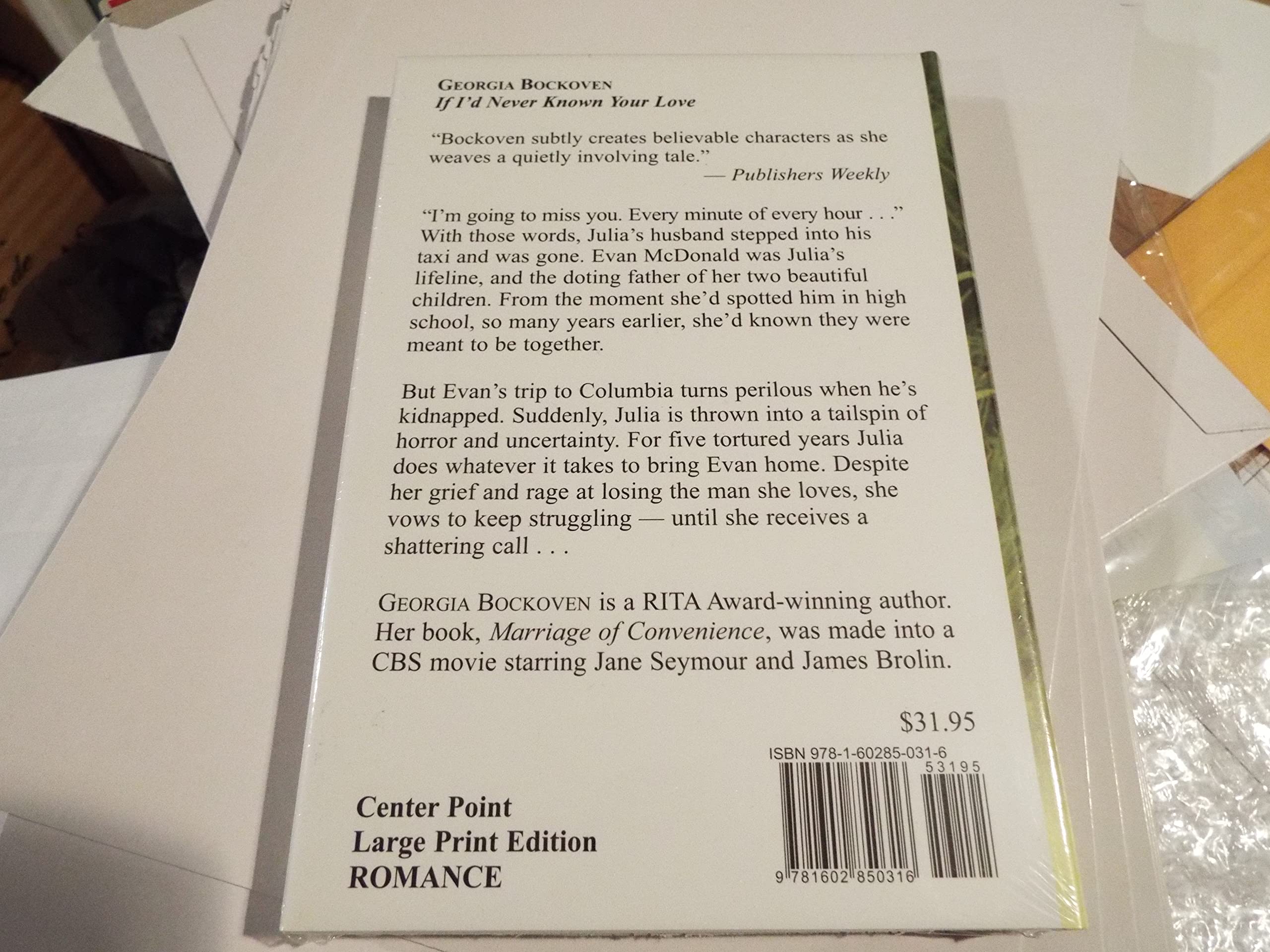 Synopsis "Bockoven subtly creates believable characters as she weaves a quietly involving tale." Publishers Weekly. "I'm going to miss you. Every minute of every hour... " With those words, Julia's husband stepped into his taxi and was gone. Evan McDonald was Julia's lifeline, and the doting father of her two beautiful children. From the moment she'd spotted him in high school, so many years earlier, she'd known they were meant to be together. But Evan's trip to Columbia becomes deadly when he's kidnapped. Suddenly, Julia is thrown into a tailspin of horror and waiting. For five tortured years Julia does whatever it takes to bring Evan home. Despite her grief and rage at losing the man she loves, she vows to keep struggling until she receives a shattering call.