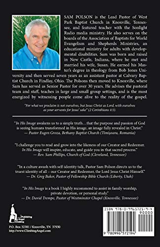 What people are saying about In His Image..."In the writing of In His Image, Pastor Polson not only does a wonderful job showing us what it means to be made in the image of God, but he also provides us with very practical steps that will help us in this transformation process. I think you will find this book to be a positive step in seeing God transform you into His image!" Mark Kirk, Pastor of Calvary Knoxville (Knoxville, Tennessee)"In a culture awash with selfidentity talk, Pastor Sam Polson directs us to the truest identity of all our Creator and Redeemer, the Lord Jesus Christ Himself. By successfully combining insightful theology and pastoral warmth, In His Image will enrich the reader's walk with God. I can see this book being particularly helpful for any Sunday school class, small group meeting, or inhome Bible study." Dr. Greg Baker, Pastor of Fellowship Bible Church (Liberty, Utah)"Beyond the profound and fascinating way in which Pastor Sam Polson takes us along the thread of the significance and practical implications of the theme of God's image in Scripture, In His Image is a book that springs as much from the study and living out of those truths, as from a rich experience of pastoral service. The book awakens us to a simple truth, old but always relevant, that the purpose and passion of God is seeing humans transformed in His image, an image fully revealed in Christ. This is the fundamental challenge of the Gospel, to which no one can remain neutral.""Pastor Sam endeared Romania (together with his wife Susan they have a son adopted from Suceava), has been involved for many years together with West Park Baptist Church in Christian mission in our country, and I am honored by his friendship and service together. I am grateful that In His Image is available in Romanian." Pastor Eugen Groza, Bethany Baptist Church (Timi?oara, Romania)"Each of us lives our daily lives based on how we answer two essential human questions, 'Who am I?' and 'Why am I here?' In His Image invites us to revisit and reframe our answers to these foundational questions. For readers who have ears to hear the Spirit speak through His Word, there is the promise of new life in the present and new hope for the future as we gain new perspectives on what it means to be fully human in Christ." Rick Dunn, Pastor of Fellowship Church Knoxville (Knoxville, Tennessee"Coram Deo is a Latin phrase translated in the presence of God, and defines how my friend Sam Polson submits to Christ and His kingdom. In this book, Pastor Sam provides a fresh and stimulating insight into the beautiful, biblical doctrine of Imago Dei, the image of God, while giving the reader the tools needed to REAP the word. In His Image is a book I highly recommend to assist in family worship, private devotion, or personal study." Dr. David Trempe, Pastor of Westminster Chapel (Knoxville, Tennessee)