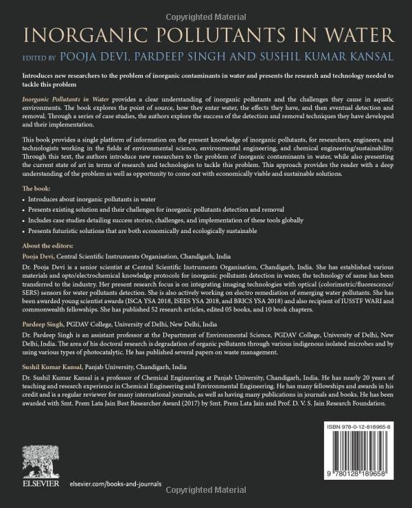 Inorganic Pollutants in Water provides a clear understanding of inorganic pollutants and the challenges they cause in aquatic environments. The book explores the point of source, how they enter water, the effects they have, and their eventual detection and removal. Through a series of case studies, the authors explore the success of the detection and removal techniques they have developed. Users will find this to be a single platform of information on inorganic pollutants that is ideal for researchers, engineers and technologists working in the fields of environmental science, environmental engineering and chemical engineering/ sustainability.Through this text, the authors introduce new researchers to the problem of inorganic contaminants in water, while also presenting the current stateoftheart in terms of research and technologies to tackle this problem. Presents existing solutions to pollution problems, along with their challenges Includes case studies that detail success stories, challenges and the implementation of these tools Provides solutions that are both economically and ecologically sustainable