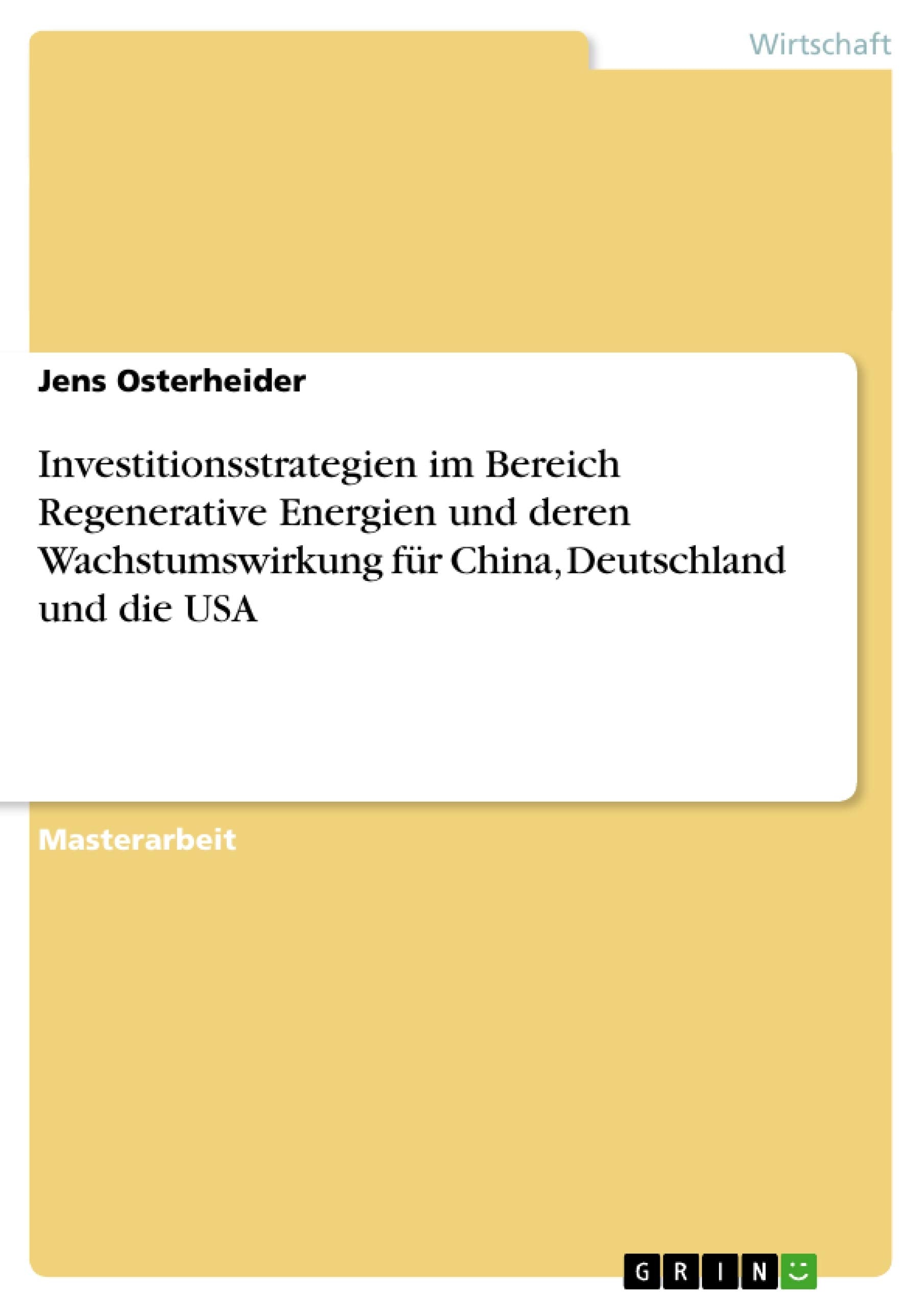Masterarbeit aus dem Jahr 2010 im Fachbereich BWL Investition und Finanzierung, Note: 1,0, RuhrUniversitt Bochum (Ostasienwissenschaften), Sprache: Deutsch, Abstract: Seit dem Inkrafttreten des KyotoProtokolls im Jahre 2005 haben viele der teilnehmenden Staaten groe Anstrengungen unternommen, um den weltweiten Aussto von sogenannten Treibhausgasen zu reduzieren. Einen ganz entscheidenden Beitrag zur Erfllung der festgelegten Ziele soll dabei die Energiegewinnung aus regenerativen Quellen wie Sonne, Wasser oder Wind liefern. Aufgrund der zunehmenden staatlichen Frderung und der steigenden Nachfrage innerhalb der Bevlkerung entstanden so in den vergangenen Jahren neue internationale Mrkte, die sich ausschlielich auf erneuerbare Energien konzentrieren.... In dieser Arbeit geht der Autor zwei unterschiedlichen Fragen nach, die sich auf die Entwicklung der Mrkte fr regenerative Energien in China, Deutschland und den USA beziehen. Die erste Frage ist, welche unterschiedlichen Strategien zur Ausweitung von Investitionen im Bereich Regenerative Energien in den jeweiligen Lndern zum Einsatz kommen und welche Rendite dabei in Aussicht gestellt wird. Die zweite Frage ist, inwieweit die jeweiligen Vorgehensweisen die gesamtwirtschaftliche Entwicklung des eigenen Landes beeinflussen. Die voneinander abweichenden Anstze sollen dabei verglichen werden, um eventuelle berlegenheiten bestimmter Strategien aufzudecken und somit Handlungsempfehlungen zu ermglichen. Zur Klrung dieser Hauptfragen geht der Autor wie folgt vor. Zunchst werden im ersten Kapitel die Grundzge der Investitionstheorie vorgestellt und die speziellen Anforderungen fr Projekte im Bereich Regenerative Energien aufgezeigt. Danach folgen theoretische berlegungen bezglich der Auswirkung von Investitionsentscheidungen auf die Wachstums und Entwicklungsperspektiven eines Landes. Erneut werden hier Besonderheiten der betrachteten Branche bercksichtigt. Im dritten Kapitel erfolgt eine Beschreib