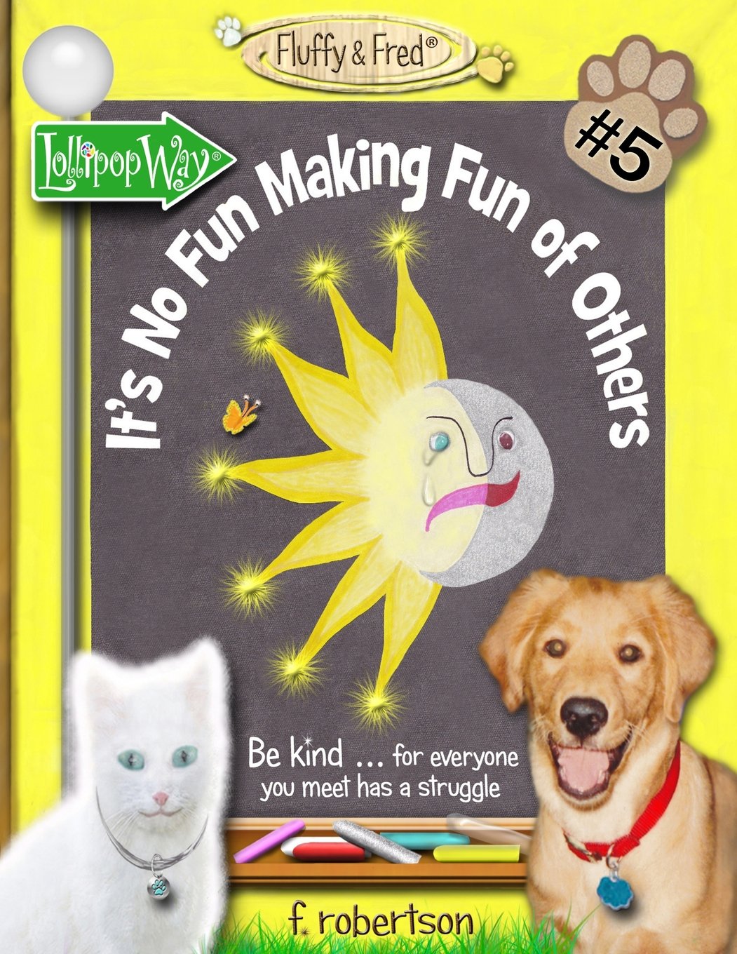 The 5th modernday fable in the enchanting Fluffy & Fred series! It's the purrfect way to help children understand that others have feelings too! Welcome to Lollipop Way where the mailboxes look like lollipops and the pets have a lot to say right here on this chalkboard! Fluffy & Fred are best friends, with a lot to learn. Its a good thing the retired guide dog, Grey, lives next door! Grey has the wisdom of many years. Although James and other children live on Lollipop Way, we mostly hear what their pets have to say! At bedtime or anytime!