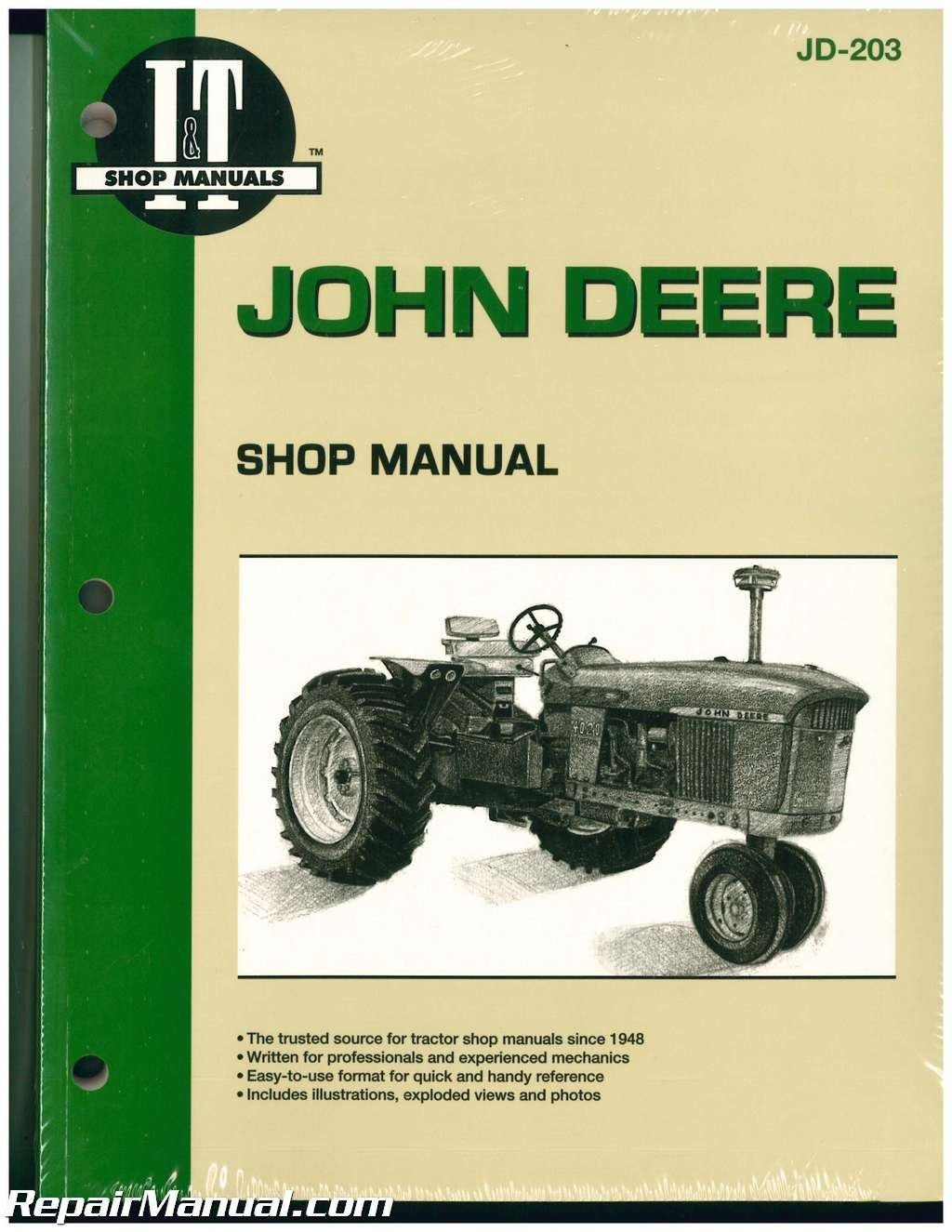 - Q: What type of binding does the John Deere Shop Manual have? A: The John Deere Shop Manual JD-203 is bound in paperback, making it lightweight and easy to handle during use.