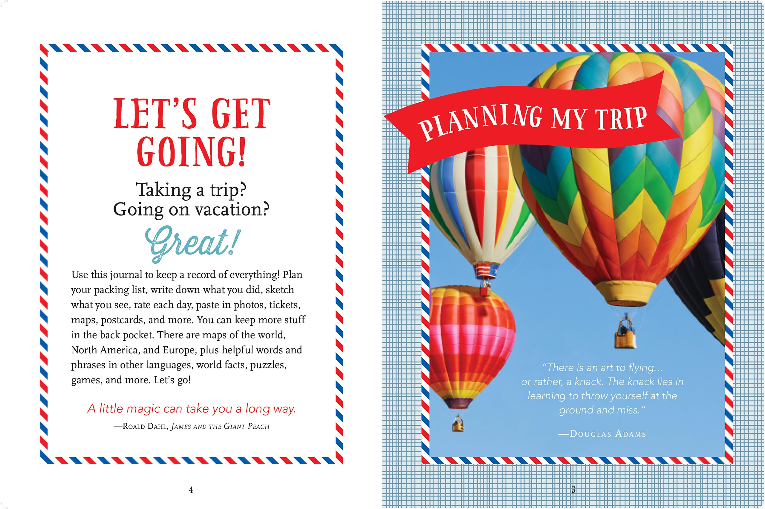 Taking a trip? Going on vacation? Great! Use this journal to keep a record of everything!Plan your trip and packing list. Write what happened on the way there and back. Write down what you did. Sketch what you saw. Rate each day. Paste in photos, tickets, maps, postcards, and more. Keep more stuff in the back pocket.Journal also includes:Puzzles and games. Maps of the world, North America, and Europe. Helpful words and phrases in other languages. Metric information. Fun world facts. Travelrelated quotes from kid's books. Fullcolor photos and illustrations. Acidfree archival paper preserves your journaling. Makes a great keepsake! Elastic band attached to back cover keeps your place or keeps journal closed. Recommended for ages 6 and up. 61/4'' wide x 81/4'' high (15.9 cm wide x 21 cm high). Sturdy hardcover binding. 96 pages.