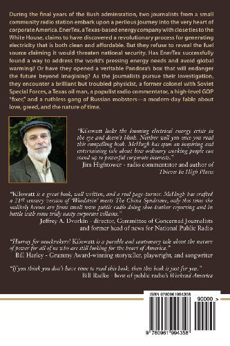 Technothriller about the perils of energy capitalism and the nature of time. Set during the final years of the Bush administration, Kilowatt tells the story of Reb Morgan and Alice Carpenter, journalists from a small community radio station in the mountains of northern California, who embark upon a perilous journey into the very heart of corporate America. EnerTex, a Texasbased energy company with close ties to the White House, claims to have discovered a revolutionary process for generating electricity that is both environmentally clean and affordable. But they refuse to reveal the details of this new technology under the pretense that to do so would threaten national security. Has EnerTex successfully found a way to address the worlds pressing energy needs and avoid global warming? Or have they, instead, opened a veritable Pandoras box that could endanger the future beyond imagining? As Reb and Alice pursue their investigation, they encounter a brilliant but troubled physicist, a former colonel with Soviet Special Forces, a Texas oil man, an ambitious deal originator, a populist radio commentator, a highlevel GOP fixer, the director of an energy watchdog group, a ruthless gang of Russian mobsters, and Avery Jordan Axton, the enigmatic president and CEO of EnerTex