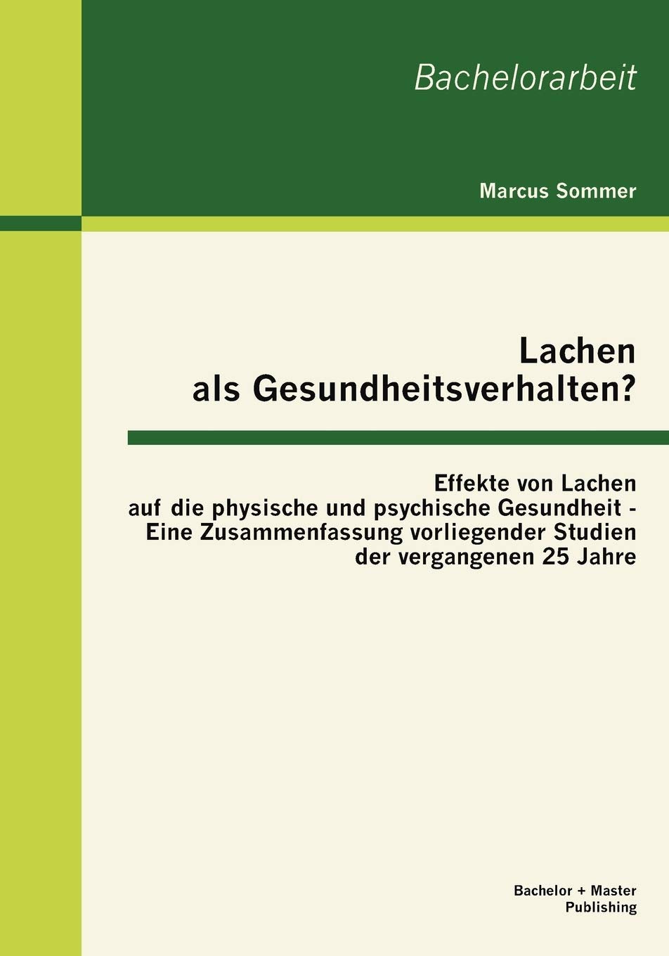 'Lachen macht schlank', 'Lachen hilft gegen Krebs', 'Lachen als StressKiller' die populren Annahmen ber die Effekte des Lachens sind reichlich und lassen sich regelmig in nichtwissenschaftlichen und wissenschaftlichen Publikationen finden. Allein die Liste der physischen Erkrankungen (Rackl, 2003), gegen die Lachen vorbeugend oder therapeutisch hilfreich sein soll, reicht derzeit von Asthma, Diabetes, Bronchitis bis zu Hypertonie oder, wie es der Psychologe Rod A. Martin berspitzt zusammenfasst 'from the common cold to AIDS' (Martin, 2007). Der populre Glaube an die positiven Effekte des Lachens auf die physische und psychische Gesundheit scheint riesig. So finden sich immer mehr Menschen, die sich zu sogenannten 'Laughter Clubs', LachYogaGruppen oder Lachseminaren treffen. Zustzlich gibt es Ratgeber und Workshops, die die Botschaft verbreiten: Lachen ist gesund! Dabei stellt sich die Frage, ob Lachen als Verhalten wirklich einen wissenschaftlich nachweisbaren Effekt auf so viele gesundheitliche Dimensionen hat. Die ersten gesundheitlichen Effekte wurden bereits von Aristoteles proklamiert (Goldstein, 1982). In den letzten 20 Jahren gab es einen erneuten Schub in der Gelatologie, der ber 50 publizierte Artikel zu dem Thema und neue differenzierte Hinweise auf mgliche Effekte hervorbrachte (Martin, 2001). In der vorliegenden Arbeit geht es darum, der aufgeworfenen Frage kritisch nachzugehen und die vorliegenden empirischen Befunde der letzten 25 Jahre zu diesem Thema zusammenzutragen, zu systematisieren und abzuwgen, welche Schlussfolgerungen aus den Ergebnissen zu ziehen und welche mglichen praktischen und therapeutischen Implikationen abzuleiten sind. Es stellt sich also die Frage, ob Lachen als mgliches Gesundheitsverhalten so wirksam ist, dass es fr gesunderhaltende beziehungsweise rehabilitierende Interventionen relevant sein knnte. Nachdem eine begriffliche Przisierung vorgenommen und die biopsychologischen Grundlagen von Lachen und Humor
