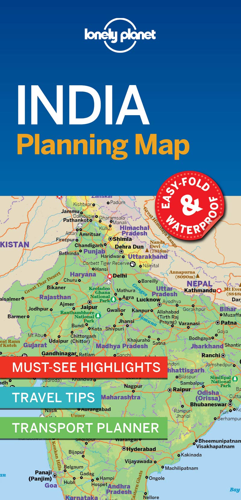 From Lonely Planet, the worlds leading travel guide publisherDurable and waterproof, with a handy slipcase and easyfold format, Lonely Planets India Planning Map helps you get around with ease.Get more from your map and your trip with images and information about top country attractions, itinerary suggestions, a transport guide, planning information, themed lists and practical travel tips.With this easytouse, fullcolour map in your back pocket, you can truly get to the heart of India. Durable and waterproof Easyfold format and convenient size Handy slipcase Full colour and easytouse Beforeyougo info Beautiful imagery Tailored itineraries Cantmiss regional highlights Detailed town index Transport planner Themed lists Covers Rajasthan, Jaipur, Jaisalmer, Ranthambhore National Park, Udaipur, Delhi, Agra, Varanasi, Lucknow, Himachal Pradesh, Ladakh, Shimla, Leh, McLeod Ganj, Manali, Kolkata, Sundarbans, Darjeeling, Assam, Mumbai, Goa, Ajanta & Ellora Caves, Kerala, Hampi, Mysuru, ChennaiLooking for more indepth coverage? Check out Lonely Planets India, our most comprehensive guide to the country featuring its top sights and most authentic offbeat experiences. Prefer just the highlights? Check out Lonely Planets Best of India guide. With inspiring and colourful photos, it focuses on Indias most popular experiences.About Lonely Planet: Lonely Planet is a leading travel media company and the worlds number one travel guidebook brand, providing both inspiring and trustworthy information for every kind of traveller since 1973. Over the past four decades, weve printed over 145 million guidebooks and grown a dedicated, passionate global community of travellers. Youll also find our content online, and in mobile apps, video, 14 languages, nine international magazines, armchair and lifestyle books, ebooks, and more.Lonely Planet guides have won the TripAdvisor Traveler's Choice Award in 2012, 2013, 2014, 2015, and 2016.'Lonely Planet. It's on everyone's bookshelves, it's in every traveller's hands. It's on mobile phones. It's on the Internet. It's everywhere, and it's telling entire generations of people how to travel the world.' Fairfax Media'Lonely Planet guides are, quite simply, like no other.' New York Times