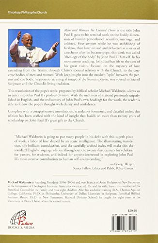 Internationally renowned Biblical scholar Michael Waldstein offers a new critical translation of Pope John Paul IIs talks on the Theology of the Body, presenting his magnificent vision of the human person with meticulous scholarship and profound insight. A Preface by Cardinal Sch?nborn, a Foreword by Christopher West, a comprehensive index of words and phrases, a Scriptural index, and a reference table for other versions of the papal texts are included. Recipient of a CPA Award!