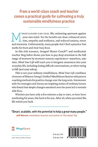 From a worldclass coach and teacher comes a practical guide for cultivating a truly sustainable mindfulness practiceMindfulness can feel like swimming upstream against your own mind. Yet the benefits are clear: enhanced attention, empathy and resilience, and reduced anxiety, stress and insomnia. Unfortunately, too many don't find a practice that works for them and their busy lives.In this rich resource, Integral Master Coach and meditation teacher Meg Salter shows you how to pay deep attention to the full range of momentbymoment sensory experiencesanywhere, anytime. Mind Your Life will teach you to integrate awareness into your everyday life, including during difficult conversations, or when trying to fall (and stay) asleep.This is not your ordinary mindfulness. Mind Your Life combines elements of Shinzen Young's Unified Mindfulness system with proven coaching methods for positive change over the long term. Interwoven with the strategies and theory are inspiring stories of ordinary heroes who found that simple changes sustained over the years led to remarkable lives.Whether you have only a few minutes a day to start, or have been meditating for years, this book is for you. After all, when you mind life, life minds you back.