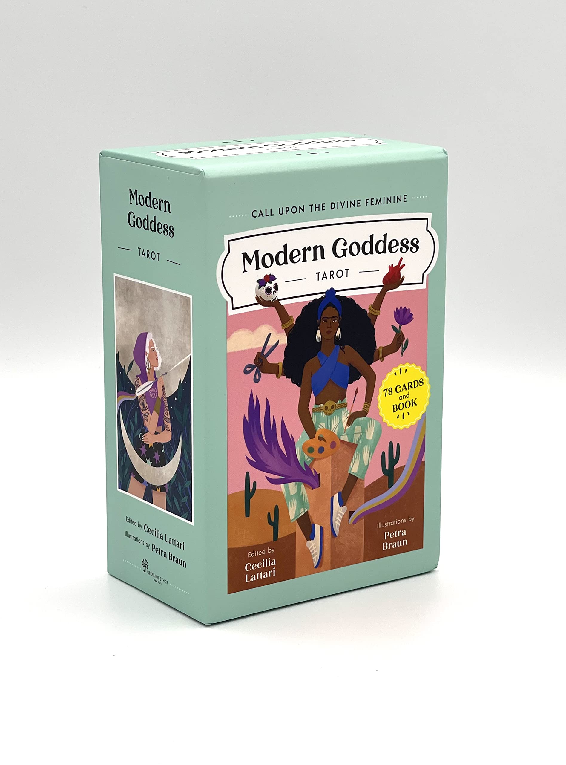 Every woman is a goddess imbued with the power of the Divine Feminine, realized through a lineage of famous females both historical and mythical.This gorgeous tarot deck, stunningly illustrated by internationally famous artist Petra Braun, looks at the classic RiderWaite tarot through the lens of these goddesses. Instead of the chaotic destructive force of The Tower, we have the beautiful and terrifying Hindu goddess Kali. Instead of The Empress, we have Hawaiian deity Pele, luxuriously clothed in flame. These boldly painted cards are an excellent way to call upon the goddesses when asking questions of yourself, your loved ones, and this world.