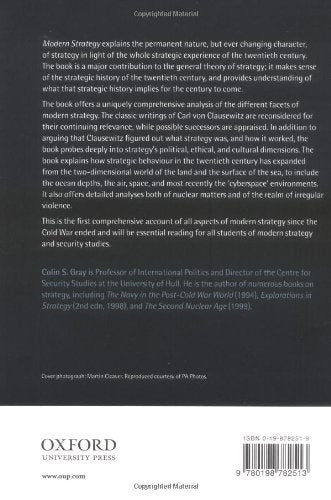 Modern Strategy Explains The Permanent Nature, But Ever Changing Character, Of Strategy In Light Of The Whole Strategic Experience Of The Twentieth Century. The Book Is A Major Contribution To The General Theory Of Strategy; It Makes Sense Of The Strategic History Of The Twentieth Century, And Provides Understanding Of What That Strategic History Implies For The Century To Come.The Book Offers A Uniquely Comprehensive Analysis Of The Different Facets Of Modern Strategy. The Classic Writings Of Carl Von Clausewitz Are Reconsidered For Their Continuing Relevance, While Possible Successors Are Appraised. In Addition To Arguing That Clausewitz Figured Out What Strategy Was, And How It Worked, The Book Probes Deeply Into Strategy'S Political, Ethical, And Cultural Dimension. The Book Explains How Strategic Behaviour In The Twentieth Century Has Expanded From The Twodimensional World Of The Land And The Surface Of The Sea, To Include The Ocean Depths, The Air, Space, And Most Recently The 'Cyberspace' Environments. It Also Offers Details Analyses Both Of Nuclear Matters And Of The Realm Of Irregular Violence.This Is The First Comprehensive Account Of All Aspects Of Modern Strategy Since The Cold War Ended And Will Be Essential Reading For All Students Of Modern Strategy And Security Studies.