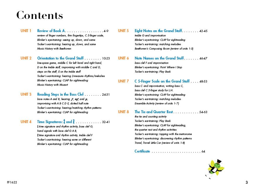 (Faber Piano Adventures ). 64 pages of funfilled activities support the music learning process. Reading steps on the staff is a primary focus of Book B. The inventive Writing Book guides young players in reading, hearing and creating with steps on the Grand Staff. Teachers will welcome the special 'C.L.A.P. for Sightreading' pages, designed to reinforce and celebrate notereading. Students touch on music history with Mozart's and Beethoven's Fun Facts and Games and take a peek into Beethoven's Composing Room. Tucker, Blinker and Tap return with eartraining, sightreading, and rhythm fun. Then there is also the Tooth Fairy Visit, Rhythm Beads, Escape of the Quarter Notes... and much more.