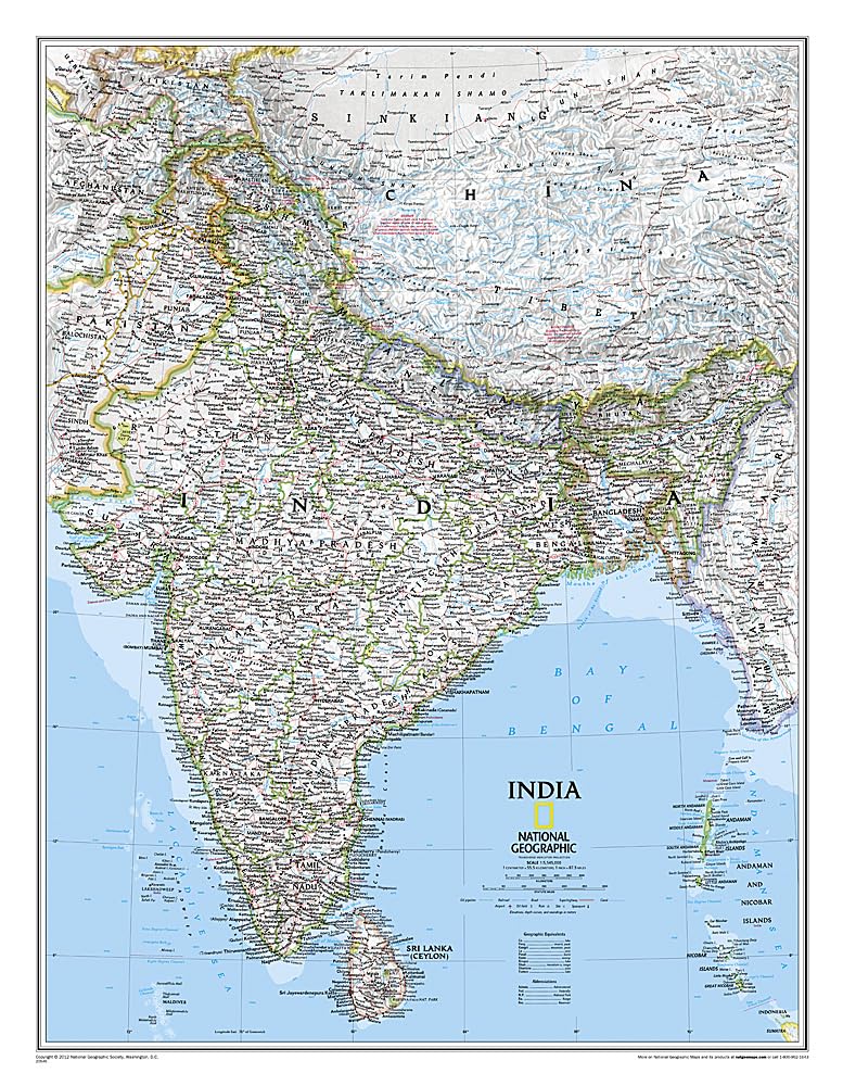 As attractive as it is functional, National Geographic's Classic style political map of India is one of the most detailed and comprehensive maps ever published for India and southern Asia. It includes India, Sri Lanka, Nepal, Bangladesh, Bhutan, Tajikistan, and portions of China, Pakistan, Afghanistan, and Myanmar. The India map is punctuated with thousands of place names, and embellished with shaded relief which highlights the region's dramatic topography in such places as the Tibetan Plateau and the Himalaya. Also shown are the country's infrastructures, including airports, railroads, super highways, canals, major oil fields and pipelines, canals, and more.The map is packaged in a two inch diameter tube with a label showing a thumbnail of the map with dimensions and other pertinent information. Map Scale = 1:5,625,000 Sheet Size = 23.5' x 30.25'