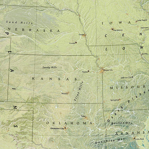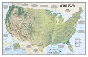 See the magnificence of the US landscape with the US Physical map. The map depicts the great variety of natural vegetation from tundra in Alaska to desert in Arizona. Notes describe the major physical regions from the Coastal Plain in the east to the Pacific Coast Mountains in the west, and beautiful handpainted relief reveals topography and major features to create a visually stunning reference map.The map is packaged in a two inch diameter tube with a label showing a thumbnail of the map with dimensions and other pertinent information. Map Scale = 1:5,200,000 Sheet Size = 38.25" x 25.25"