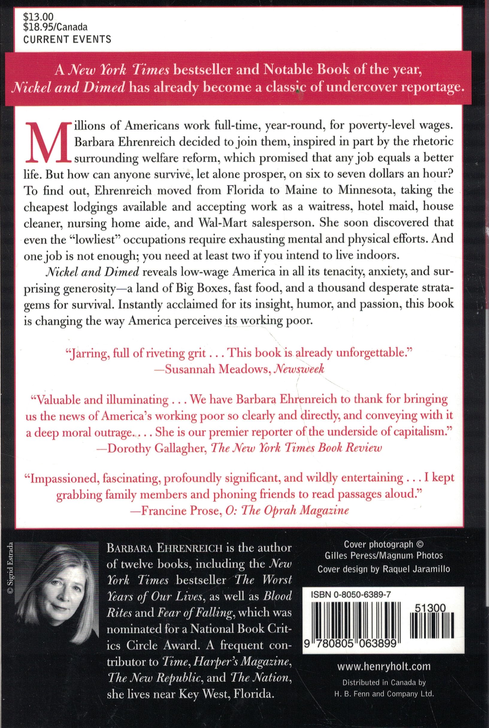 The New York Times bestseller, and one of the most talked about books of the year, Nickel and Dimed has already become a classic of undercover reportage.Millions of Americans work for povertylevel wages, and one day Barbara Ehrenreich decided to join them. She was inspired in part by the rhetoric surrounding welfare reform, which promised that any job equals a better life. But how can anyone survive, let alone prosper, on $6 to $7 an hour? To find out, Ehrenreich moved from Florida to Maine to Minnesota, taking the cheapest lodgings available and accepting work as a waitress, hotel maid, house cleaner, nursinghome aide, and WalMart salesperson. She soon discovered that even the 'lowliest' occupations require exhausting mental and physical efforts. And one job is not enough; you need at least two if you intend to live indoors.Nickel and Dimed reveals lowwage America in all its tenacity, anxiety, and surprising generosity a land of Big Boxes, fast food, and a thousand desperate strategies for survival. Instantly acclaimed for its insight, humor, and passion, this book is changing the way America perceives its working poor.