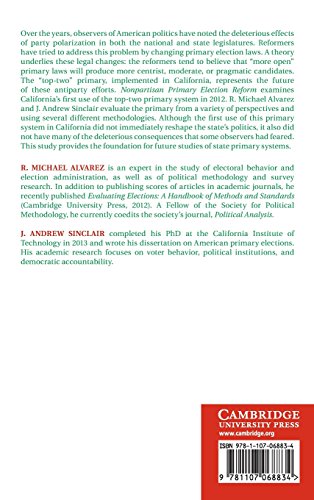Over the years, observers of American politics have noted the deleterious effects of party polarization in both the national and state legislatures. Reformers have tried to address this problem by changing primary election laws. A theory underlies these legal changes: the reformers tend to believe that more open primary laws will produce more centrist, moderate, or pragmatic candidates. The toptwo primary, just implemented in California, represents the future of these antiparty efforts. Mitigating Mischief examines California's first use of the toptwo primary system in 2012. R. Michael Alvarez and Andrew Sinclair evaluate the primary from a variety of perspectives and using several different methodologies. Although the first use of this primary system in California did not immediately reshape the state's politics, it also did not have many of the deleterious consequences that some observers had feared. This study provides the foundation for future studies of state primary systems.