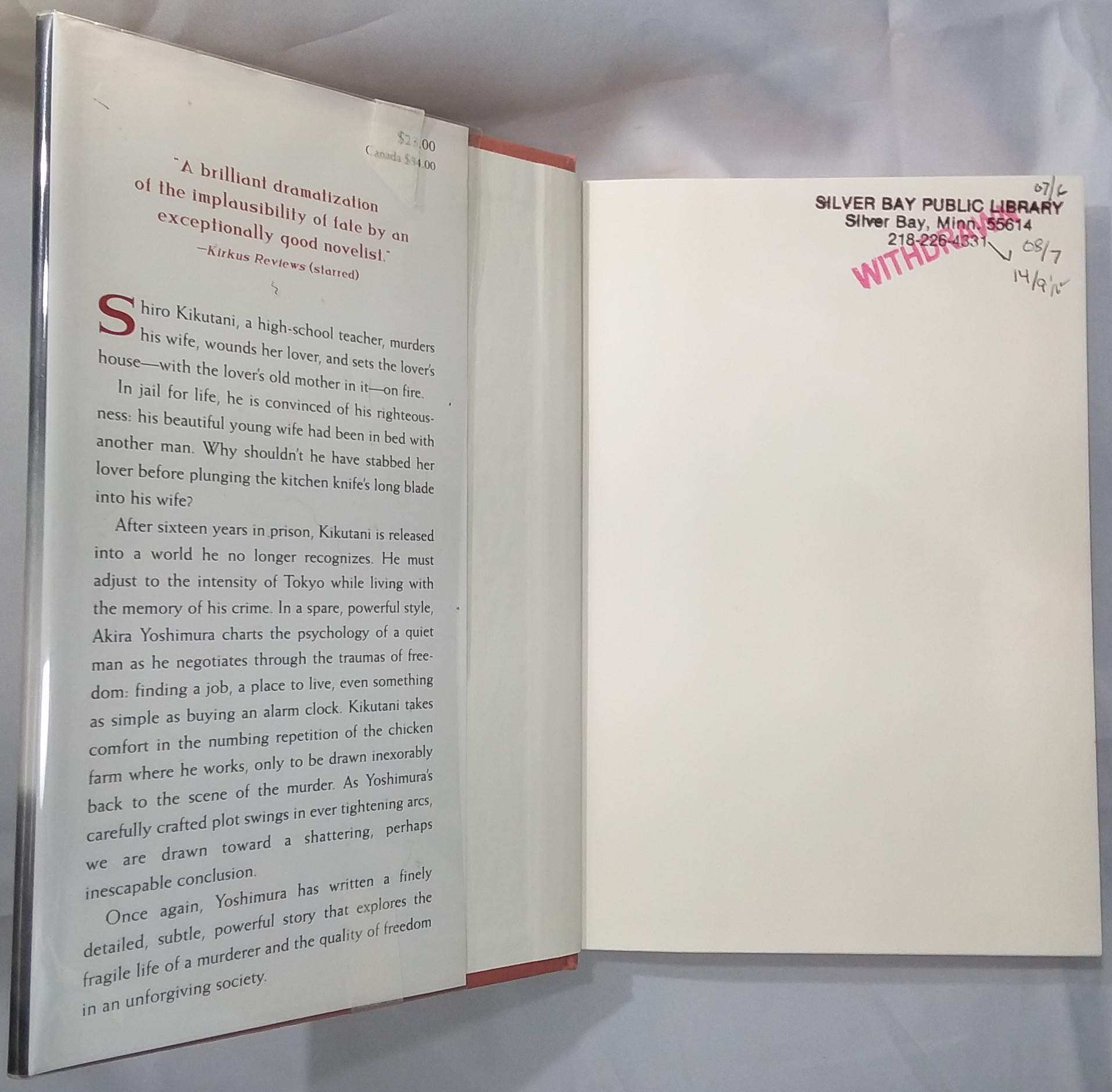 A Man Murders His Wife, Wounds Her Lover, And Sets The Lovers Homewith The Lovers Mother In Iton Fire. Sixteen Years Later, 50Yearold Shiro Kikutani, A Former Highschool Teacher Serving A Life Sentence For This Crime, Is Released. In Jail, He Had Thought Of Nothing But Freedom. His Release, However, Creates A Series Of Obstacles For Which He Is Not Prepared. While He Continually Examines His Conscience, He Feels No Remorse. On Parole, He Slowly Begins To Lead A Normal Life, And That Life Seems Livable, Until His New Wife Pressures Him To Express Remorse He Does Not Feel. Once Again, Yoshimura Has Written A Finely Detailed, Subtle, Powerful Story That Explores The Fragile Life Of A Murderer And The Quality Of Freedom In An Unforgiving Society.