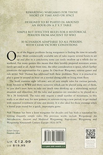 One of the biggest problems facing wargamers is finding the time to actually play. Most commercially available sets of rules require several hours to set up and play to a conclusion; some can easily swallow up a whole day or weekend. For many gamers this means that their lavishly prepared miniature armies rarely get used at all. Apart from time, the other consideration is space, which further constrains the opportunities for a game. In Onehour Wargames, veteran gamer and rulewriter Neil Thomas has addressed both these problems. Now it is practical to play a game in around an hour on a normal dining table or living room floor.The book contains 8 (allnew) sets of very simple rules for various periods, from Ancient to WW2 and 30 scenarios which can be played using any of them, so you dont even have to take too much time thinking up a stimulating tactical situation and objectives. All the rules and scenarios are intended to be played on a 3ft x 3ft battlefield. The rules only require a small number of miniatures, so this really is an ideal way for new gamers, or veterans trying a new period, to get started with minimal investment of time and money. Also ideal for a quick game in the evening when a friend pops round. There are also sections on campaigns and solo games.