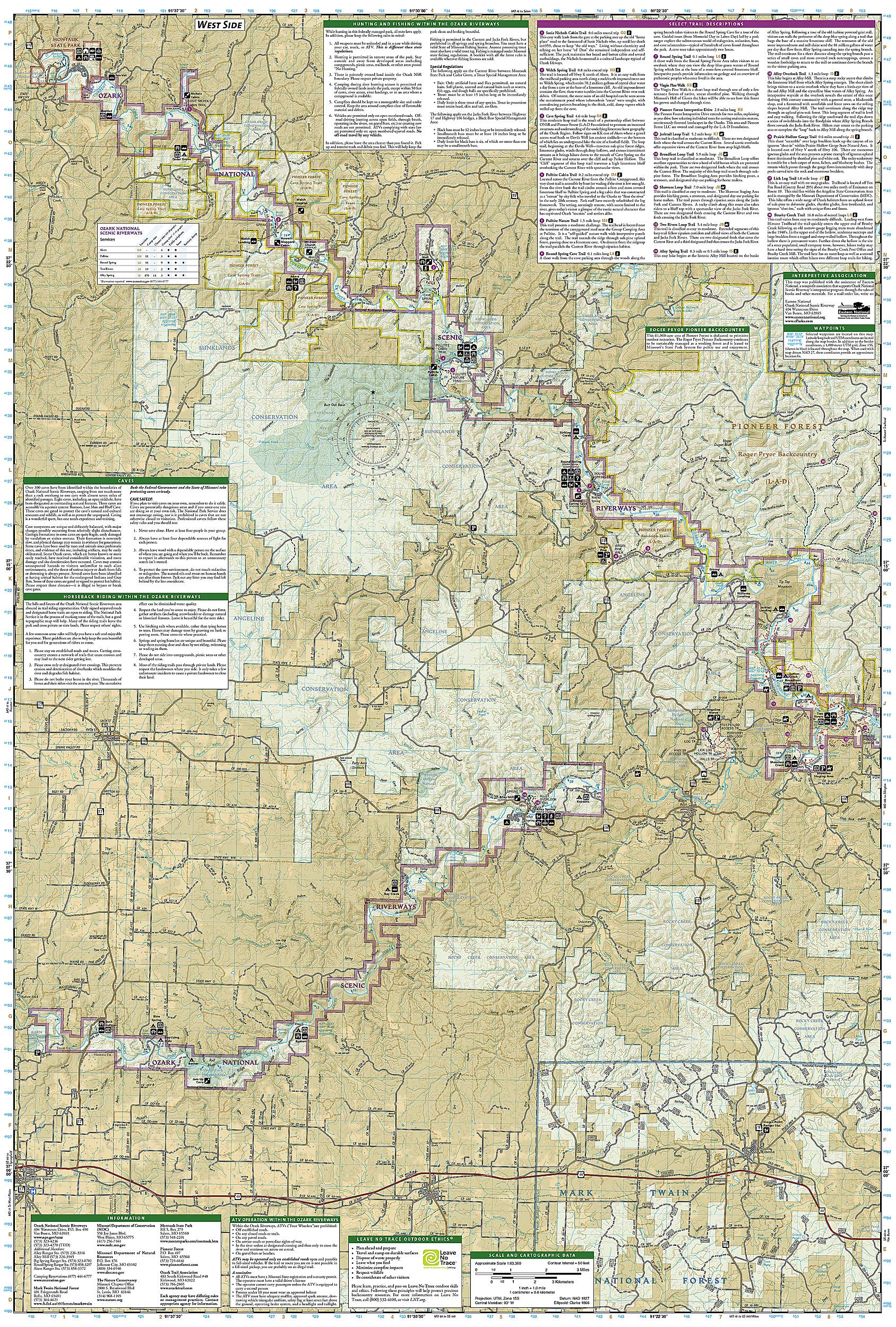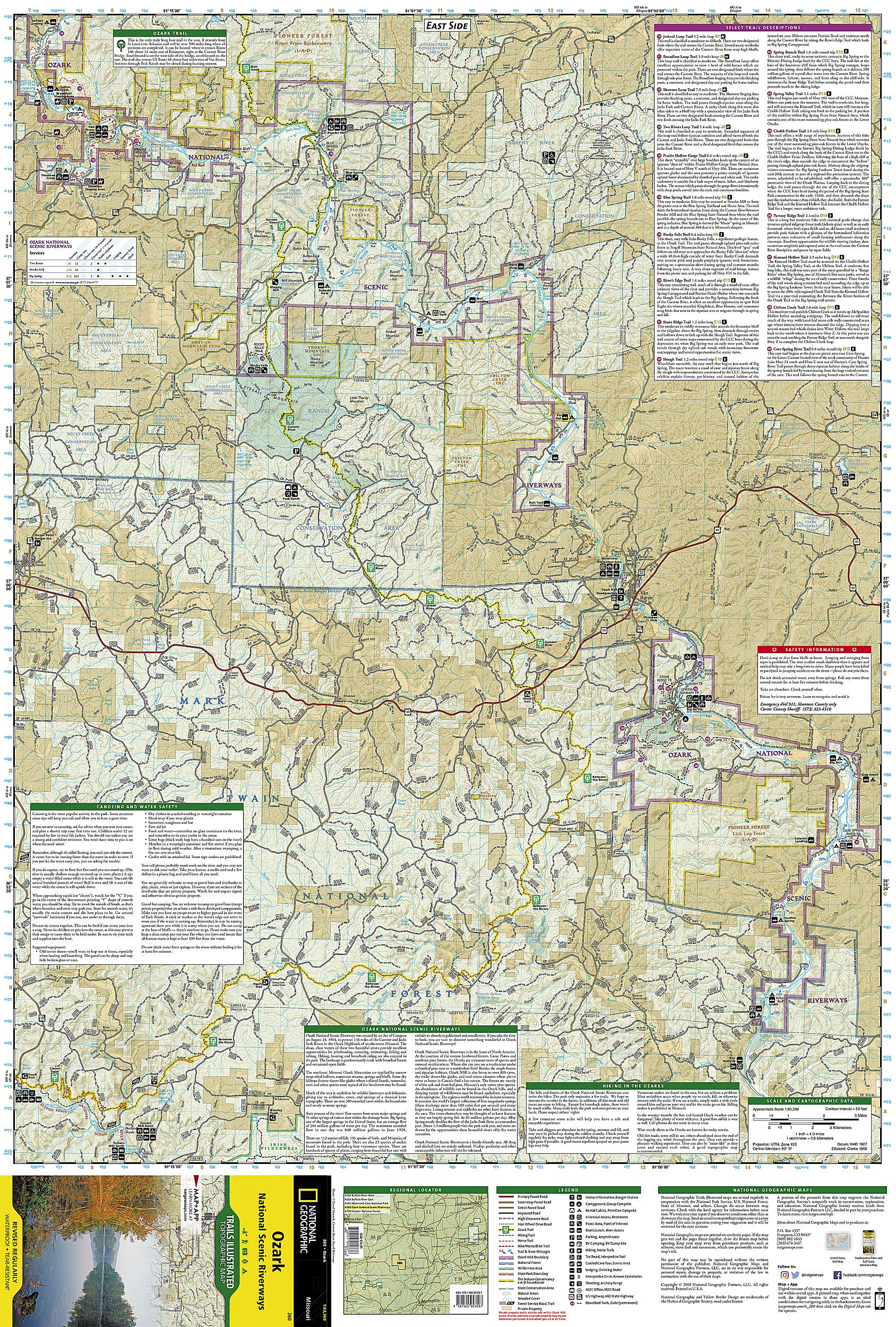 Waterproof TearResistant Topographic MapExplore the beauty and serenity of the Current and Jacks Fork rivers as they meander through southeastern Missouri's Ozark Mountains with National Geographic's Trails Illustrated map of Ozark National Scenic Riverways. Created in partnership with local land management agencies, this expertly researched map delivers unmatched detail and helpful information for experienced outdoor enthusiasts and casual visitors alike. Key areas of interest featured on this map include Montauk State Park, Roger Pryor Pioneer Backcountry, Pioneer Forest, Angeline Conservation Area, Mark Twain National Forest, Stegall Mountain, and Peck Ranch.This map can guide you off the beaten path and back again with miles of mapped trails including a portion of the Ozark Trail. Trail mileage between intersections will help you choose the path that's right for you. River mileage is noted as well, for those exploring by boat. Select trail summaries, safety tips, and information about many recreational opportunities available in the region including hiking, hunting, fishing, canoeing, horseback riding, spelunking, and more will help you make the most of your visit. The map base includes contour lines, shaded relief, and elevations for summits and passes. Many recreation features are noted as well, including campgrounds, boat launches, river access, trailheads, interpretive trails, shooting and archery ranges, interpretive drives, and points of interest.Every Trails Illustrated map is printed on "Backcountry Tough" waterproof, tearresistant paper. A full UTM grid is printed on the map to aid with GPS navigation.Other features found on this map include: Mark Twain National Forest, Ozark National Scenic Riverway, Spring Valley. Map Scale = 1:63,360 Sheet Size = 25.5" x 37.75" Folded Size = 4.25" x 9.25"