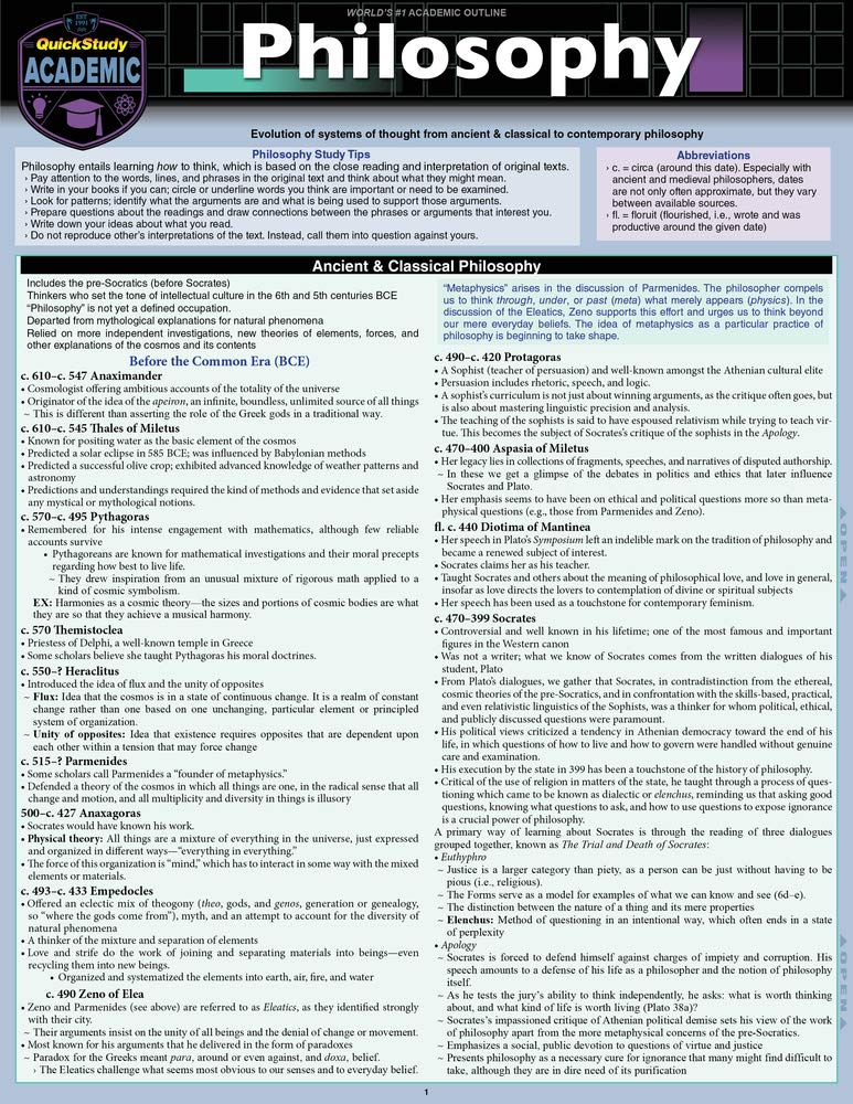 Essentials of philosophy expertly authored to succinctly cover historical details and key ideas that shaped the evolution of thought from ancient and classical to contemporary philosophy. Each philosopher and their evolutionary contributions are included and organized chronologically in 6 laminated pages for a powerful tool for support, reference and review for students or laymen to find answers for upcoming exams... or the ultimate question;)6 page laminated guide includes: Ancient & Classical Philosophy Includes PreSocratics Thinkers Setting Tone in 5th/6th century BCE Departing Mythological Explanation for Natural Phenomena Medieval Philosophy Early Modern Philosophy Modern Philosophy Contemporary Philosophy