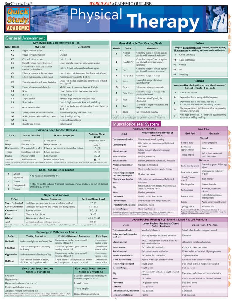 Comprehensive guide on definitions and assessments related to the Physical Therapy field.This 6page laminated guide covers the following topics:General AssessmentMusculoskeletal SystemNeuromuscular SystemCardiovascular & Pulmonary SystemsIntegumentary System