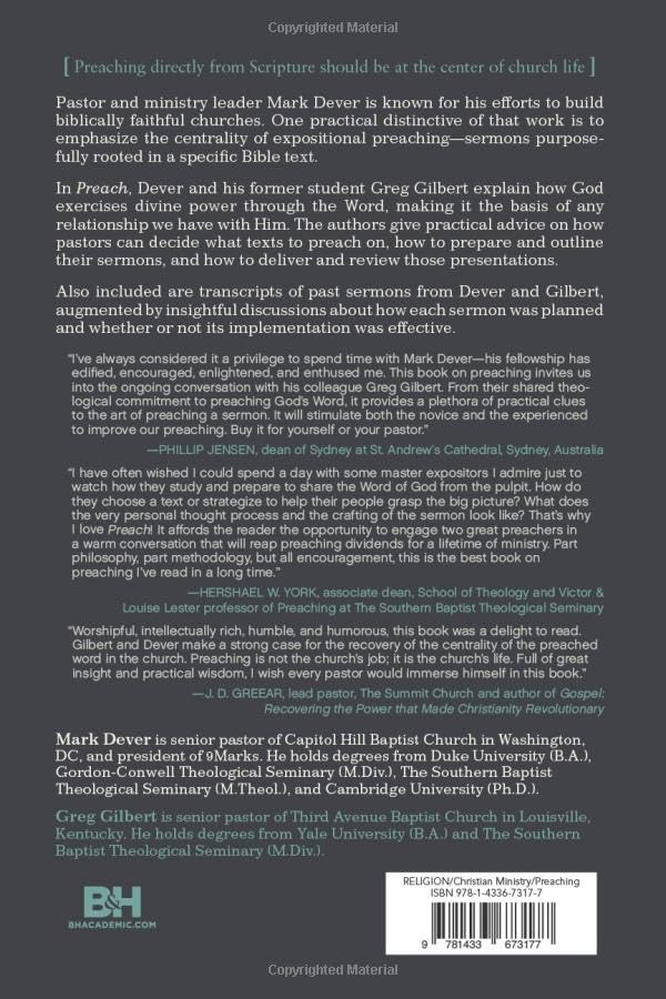 Mark Dever, senior pastor of Capitol Hill Baptist Church in Washington, DC, and president of 9Marks, is widely respected for his efforts to build biblically faithful churches in America that will impact the nations. In this book about one of the practical distinctives of that work, Dever and his former student Greg Gilbert offer a theological and practical guide emphasizing the centrality of expositional preaching sermons intentionally rooted in a specific Bible text.Dever and Gilbert clearly explain how God exercises His divine power through the Word, making it the basis of any relationship we have with Him. Thus, preaching directly from Scripture should be at the center of church life. Toward that goal, the authors give practical advice on how pastors can decide what texts to preach on, how to prepare and outline their sermons, and how to deliver and review those presentations.Pastors will especially appreciate the books final section: transcripts of past sermons from Dever and Gilbert augmented by insightful conversations between them about how each sermon was planned and whether or not is was effectively implemented.