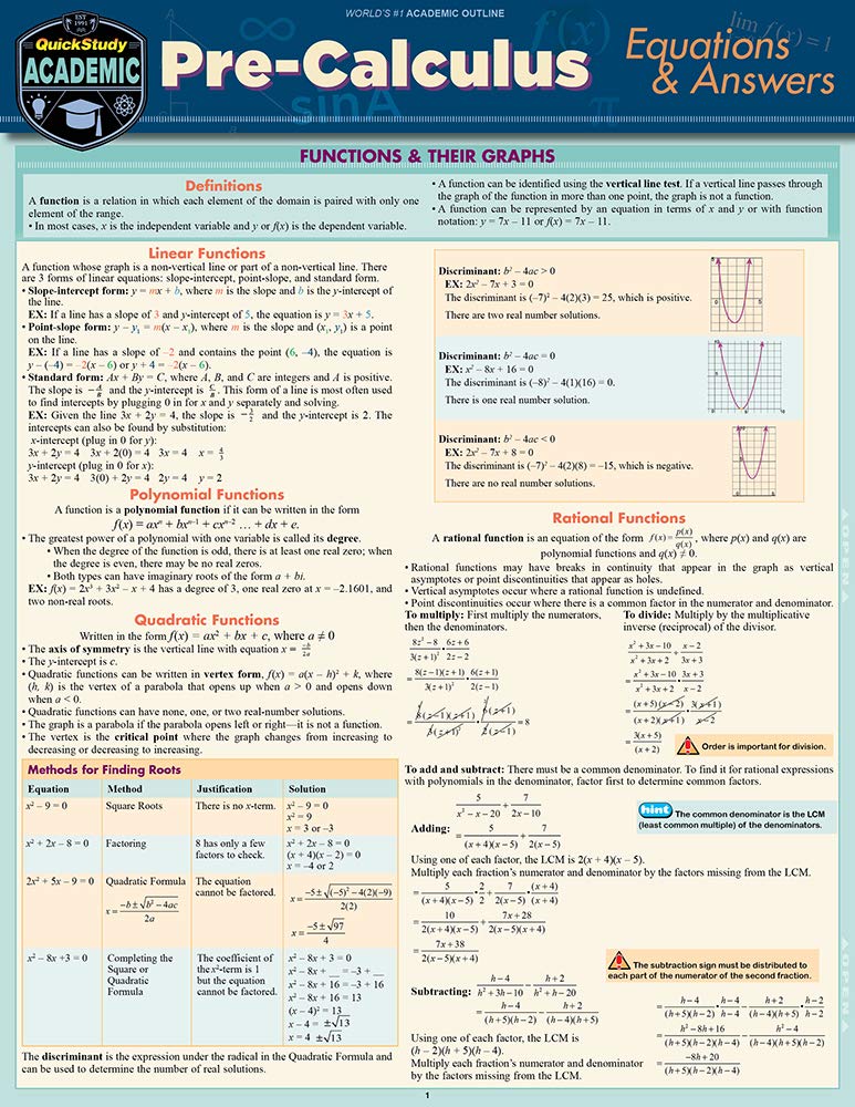 Each step higher in math studies is crucial to doing well at the next level. Support for this gateway course to Calculus is needed among most people heading through that gate to successful careers in science, engineering, computers and economics. Our math authors at ExpoLog who also write math textbooks take great care to cover the core of what students need to know to succeed. Expertly authored and designed, this powerful and amazingly affordable 6 page laminated guide offers clear and concise examples, explanations, and the graphs that go with them. QuickStudy math guides have helped many students push through a difficult course and have helped others shine even brighter. Great for exam reviews, regular weekly study or reference in class.6 page laminated guide includes: Functions & Their Graphs Linear Functions Polynomial Functions Quadratic Functions Rational Functions Exponential Functions Logarithmic Functions Inverse Functions Parent Functions Transformations of Functions Trigonometry Right Triangle Trigonometry Degrees & Radians Trigonometric Functions & the Unit Circle Graphs of Trigonometric Functions Vectors, Parametric Equations, Polar Coordinates & Complex Numbers Conic Sections Introduction to Calculus Limit of a Function Derivatives
