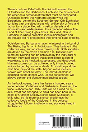 An infant, symbolizing the individual spirit, is born into a society in which individualism is suppressed through brute force. The infant's name is Mutilation, born on OrbEarth, to collectivized humans calling themselves Outsiders who live in the Great Metropolis. Outsiders tolerate no opposition. Everyone must look, think, and, sound alike without dissent, and, up until Mutilation's appearance, there is none. But, with the child's birth, everything changes. The Outsiders are in for one heck of a ride. What follows is the pressure of the state to institute conformity, conflict, resistance, and reaction.