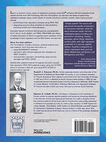 SAS System for RegressionLearn to perform a wide variety of regression analyses using SAS software with this exampledriven revised favorite from SAS Publishing. With this Third Edition you will learn the basics of performing regression analyses using a wide variety of models including nonlinear models. Other topics covered include performing linear regression analyses using PROC REG diagnosing and providing remedies for data problems, including outliers and multicollinearity.Examples feature numerous SAS procedures including REG, PLOT, GPLOT, NLIN, RSREG, AUTOREG, PRINCOMP, and others. A helpful discussion of theory is supplied where necessary. Some knowledge of both regression and the SAS System are assumed.New for this editionThe Third Edition includes revisions, updated material, and new material. Youll find new information on using SAS/INSIGHT software regression with a binary response with emphasis on PROC LOGISTIC nonparametric regression (smoothing) using moving averages and PROC LOESS.Additionally, updated material throughout the book includes highresolution PROC REG graphics output, using the OUTEST option to produce a data set, and using PROC SCORE to predict another data set.