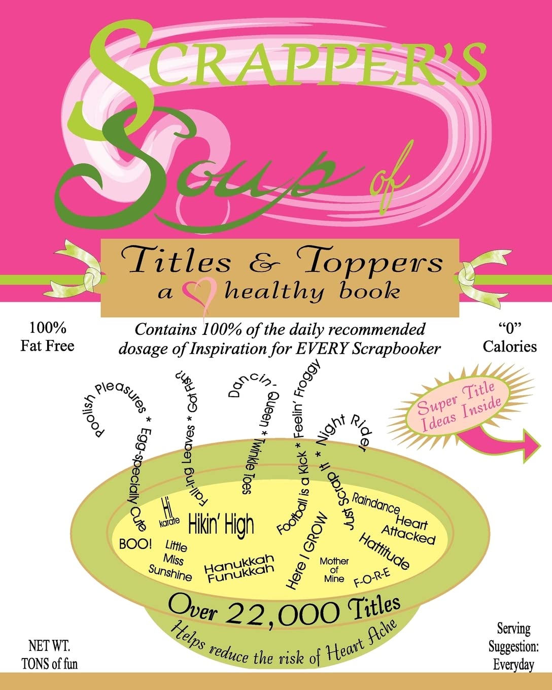 Filled up with this wealth of Titles & Toppers helping to tell your layout's story in a title, will surely knock their socks off.. With over 22,000 whimsical, funny, thoughtprovoking, amusing, inspirational and spiritual titles, oneliners, expressions, cliches, playsonwords and sayings to choose from, this book will be your best friend forever. There are more than 400 categories jampacked with titles just waiting to be used on your pages. Whenever possible, the titles are crossreferrenced and/or given other possibilities to look at for further encouragement. Each page has the appropriate letter down the side for further ease in finding exactly what you want. You'll have so much fun reading all the titles that you'll find yourself wanting to create a layout based on a title you read. With this book in your possession, you'll never lack inspiration for a page title again. This book is an absolute "MUST HAVE" for every scrapbooker.