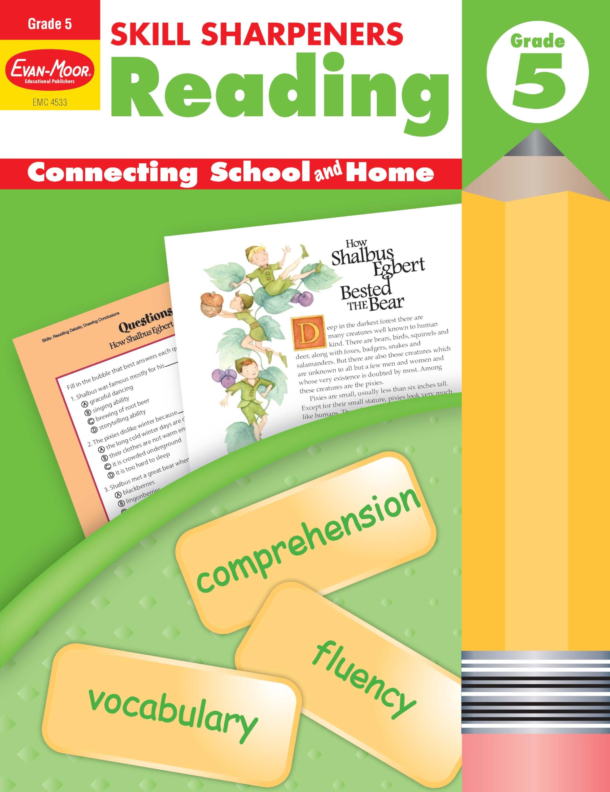 Help children improve their reading skills with this engaging fullcolor workbook!Skill Sharpeners Reading, Grade 5 includes 12 motivating fiction and nonfiction stories followed by activity pages that practice a variety of reading skills.Fiction stories include: 'The Tiger and the Jackals' 'Old Bragwynn the Pirate' 'How Shalbus Egbert Bested the Bear 'Nonfiction stories include: 'Tracking Tornadoes' 'Silkworms' 'Joy Adamson: Living with Lions'Activity pages include: comprehension questions a vocabulary exercise for every storyOther skills addressed include the following: critical thinking interpreting graphic information reading with expression, analyzing charactersEvery Skill Sharpeners workbook now includes a free downloadable Teaching Guide! The Skill Sharpeners: Reading Teaching Guides include: How to Use directions for teaching reading skills and vocabulary Sample pacing guide to complete lessons and activities Teaching suggestions for analyzing texts Extension activities that include graphic organizers, reading journals, and handson activities to help children connect their learningAbout EvanMoorA leader in PreK8 educational publishing, EvanMoor has been a trusted partner of teachers and parents for over 40 years. Our mission is helping children learn, and we do this by creating resources that motivate children to learn important skills and concepts across the curriculum while also inspiring a love of learning.