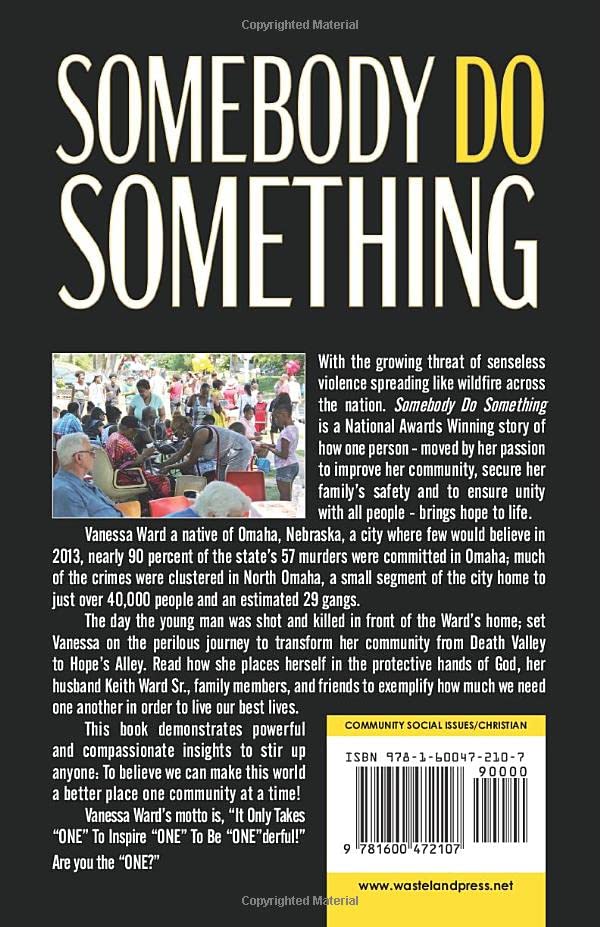 Read the magnificent story of one woman's struggle to change her surroundings. Through prayer, love, and help from friends and family, read how one person can change the course of society and effectively make a difficult situation into something beautiful. Apostle Vanessa Ward's Somebody Do Something is a riveting tale of triumph of good over evil and is a necessary addition to any library that cares for the future of society and the world at large.