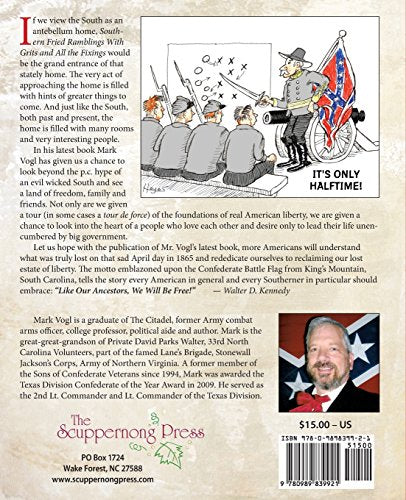 If we view the South as an antebellum home, Southern Fried Ramblings With Grits and All the Fixings would be the grand entrance of that stately home. The very act of approaching the home is filled with hints of greater things to come. And just like the South, both past and present, the home is filled with many rooms and very interesting people. In his latest book Mark Vogl has given us a chance to look beyond the p.c. hype of an evil wicked South and see a land of freedom, family and friends. Not only are we given a tour (in some cases a tour de force) of the foundations of real American liberty, we are given a chance to look into the heart of a people who love each other and desire only to lead their life unencumbered by big government.