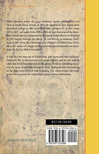Rufus Matthew Jones, the great American Quaker philosopher, was born in South China, Maine, in 1863. He received his B.A. degree from Haverford College in 1885, an A.M. in 1886, and an LL.D. in 1922. From 1917 to 1927, and again from 1934 to 1944, he was chairman of the American Friends Service Committee for European Relief which was founded in 1917 largely through his efforts. He was serving as honorary chairman in 1947 when the Committee was awarded the Nobel Peace Prize.; He is the author of a large number of works, predominantly on mysticism. He died in 1948 at Haverford. St Paul the Hero was one of Rufus Jones' few excursions into children's literature, but it was received with great acclaim, and we can only be sorry that he did not continue in this genre. It tells in a thrilling narrative the story of Saul who became St Paul, combined with intimations of the deep inner level of understanding that characterizes the many works on mysticism for which Rufus Jones is most well known.