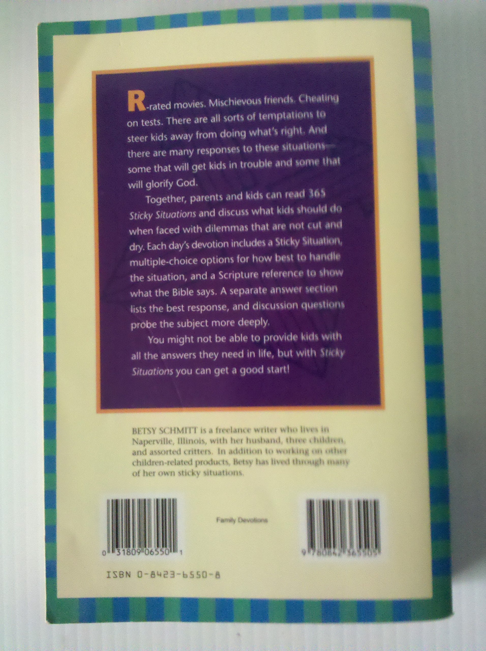 Sticky Situations is a devotional book for families with children ages 8 to 12 that offers short readings for each day of the year. Each reading begins with a kid who is facing a moral dilemma and ends with multiplechoice solutions for the family to discuss. Often there is more than one acceptable course of action to take. Parents will find tips in the back of the book that interpret the various choices made by the children and offer followup questions for further discussion on each topic. Scripture references are provided to give biblical insight into each situation. Sticky Situations is a great discussion starter that will give parents the chance to share their own values with their children.