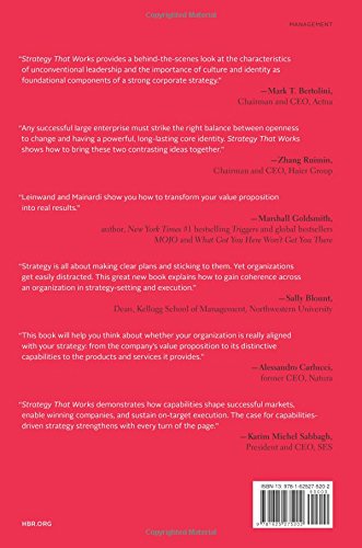 How to close the gap between strategy and executionTwothirds of executives say their organizations dont have the capabilities to support their strategy. In Strategy That Works, Paul Leinwand and Cesare Mainardi explain why. They identify conventional business practices that unintentionally create a gap between strategy and execution. And they show how some of the best companies in the world consistently leap ahead of their competitors. Based on new research, the authors reveal five practices for connecting strategy and execution used by highly successful enterprises such as IKEA, Natura, Danaher, Haier, and Lego. These companies: Commit to what they do best instead of chasing multiple opportunities Build their own unique winning capabilities instead of copying others Put their culture to work instead of struggling to change it Invest where it matters instead of going lean across the board Shape the future instead of reacting to itPacked with tools you can use for building these five practices into your organization and supported by indepth profiles of companies that are known for making their strategy work, this is your guide for reconnecting strategy to execution.