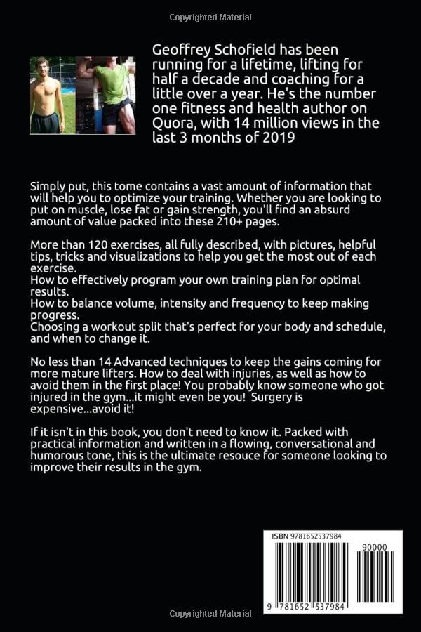 Simply put, this tome contains a vast amount of information that will help you to optimize your training. Whether you are looking to put on muscle, lose fat or gain strength, you?l find an absurd amount of value packed into these 210 pages. More than 120 exercises, all fully described, with pictures, along with helpful tips, tricks and visualizations to help you get the most out of each exercise. Dont waste your effort, gym membership or most importantly your time. Optimize your growth. How to assess your current levelare you beginner, intermediate or advanced? Does it matter? How to effectively program your own training plan for optimal results. Anyone can get average results. Optimize, baby! How to balance volume, intensity, and frequency to keep making progress. Avoid overtraining. Avoid undertraining. Achieve perfect training. Ideal sets and reps for each exercise, and how to progress over time. Choosing a workout split that? perfect for your body, mind, and scheduleand when to change it. Indepth risk versus reward analysis for all exercises. Choose the best exercises for your goals. How to keep a training log, and what to write down each workout, and what doesnt matter. What equipment is neededwhat? vital, what? useful, and what? useless? No less than 14 Advanced techniques to keep the gains coming for more mature lifters, ranging from dropsets and supersets to clusters and EMOM sets, all fully described and illustrated with examples. The various forms of cardio. How to choose the right intensity level for your goals as well as program it into a workout schedule. Wonder no morethis section will make everything crystal clear. How to deal with injuries, as well as how to avoid them in the first place! You probably know someone who got injured in the gym?t might even be YOU! A vital section for long term progress, packed with tips and tricks to stay healthy, divided up both by body part and specific lifts that commonly cause issues. Surgery is expensive?void it! 6 full training plans: Lazy Man? Plan , Busy Man? Plan , Athlete? Power Plan, Beast Plan, Deva Plan and Spartan Plan, each with multiple difficulties and adjustable to YOU. All are fully described and detailed. How to keep making progress by adjusting your trainingwhether it is a minor tweak or a neartotal overhaul, having the flexibility to alter your program and still move forward is vital. Life isnt perfect. But your training can still be. Strength standardshow do you stack up against others? Are you strong, weak, or somewhere in the middle? Full goals to target for not just the basic compound movements but dozens of exercises. All of this written in a quick, lively, humorous tone that makes the pages somehow fly by.Within these 67,000 words is the ability to learn everything you need to know about how to effectively and efficiently change your body. It? everything that I?e learned over my 5 year journey. And now...its yours.