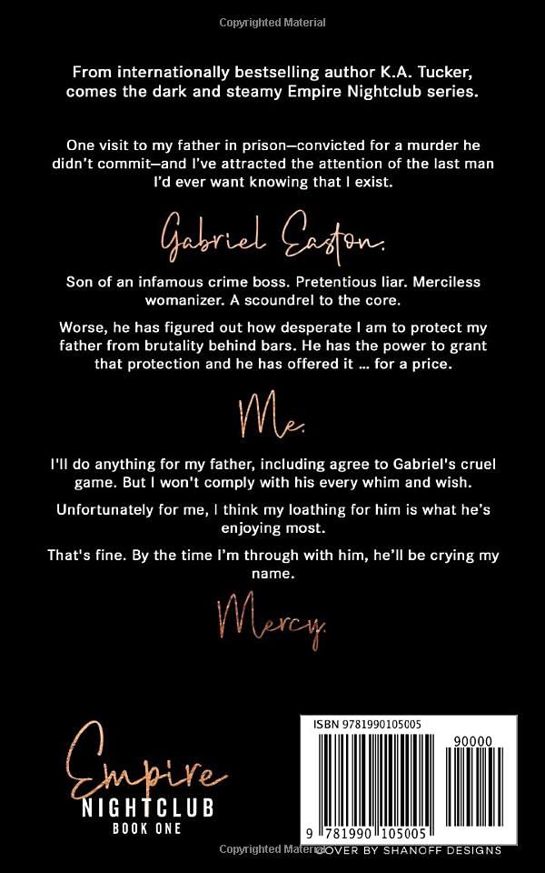 From internationally bestselling author K.A. Tucker comes the dark and steamy Empire Nightclub series.One visit to my father in prisonconvicted for a murder he didn? commitand I?e attracted the attention of the last man I? ever want knowing that I exist.Gabriel Easton.Son of an infamous crime boss. Deplorable womanizer. Scoundrel to the core.Worse, he has figured out how desperate I am to protect my father from brutality behind bars. He has the power to grant that protection, and he has offered it ?for a price.Ill do anything for my father, including agree to Gabriels cruel game. But I wont comply with his every whim and wish.Unfortunately for me, I think my loathing for him is what he? enjoying most.Thats fine. By the time I? through with him, he?l be crying my name.Mercy.