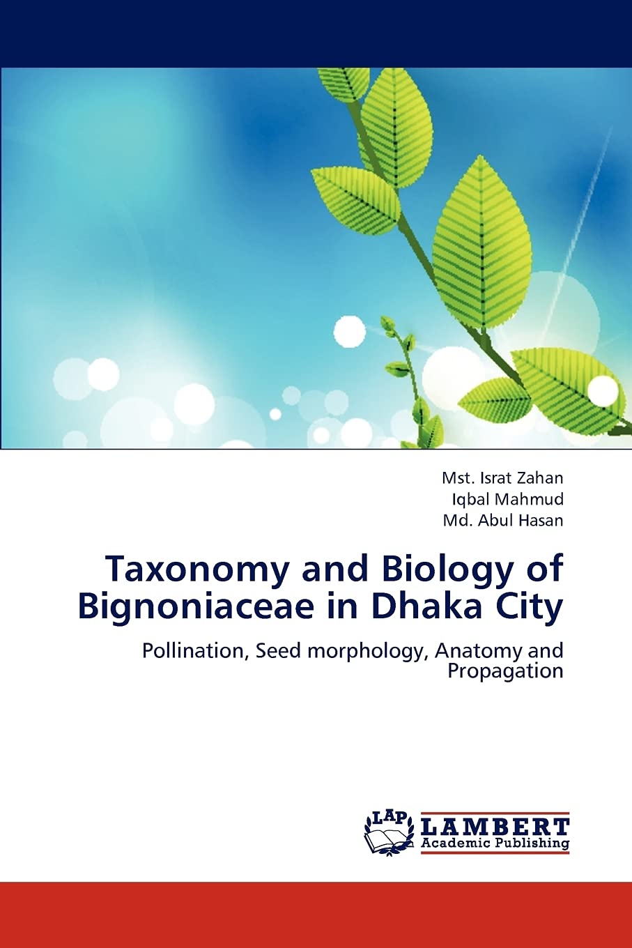 The family Bignoniaceae has been studied for Dhaka city in Bangladesh. A total of 18 species under 17 genera have been recorded from different areas of Dhaka. The germplasm of most of the species have been collected and planted in the experimental plots of Dhaka University Botanical garden for further studies. A detail taxonomic description, valid scientific names, along with synonyms, English name, Bengali name, flowering and fruiting period, chromosome number, habitat, geographical distribution and economic uses have been provided under each species. A dichotomous bracketed key to the genera and species have also been provided. Mechanism of plant propagation of 16 selected species and pollination mechanism of 9 selected species has been investigated. There is no self pollination in 18 examined species. Only cross pollination present due to presence of heterostyly. The percentage of seed germination and viability revealed epigeal type. Seed surface morphology of 6 selected species showed a great variation in different seed characters. Anatomical investigation including trichromes, stomata and stem anatomy revealed variation.