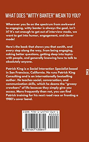 Think quickly on your feet: be smooth, funny, and clever all at once. Goodbye awkward silences, hello conversational agility!No matter where you lie on the spectrum of awkward to engaging, witty banter is always the end goal and it should be. Witty banter, and all the steps that lead to it, allows you to (1) disarm and connect with anyone, (2) immediately exit boring small talk mode, and (3) instantly build rapport like you're old friends.Flow with the conversational twists and turns like water.The Art of Witty Banter carefully examines the art, nuance, and mechanics of banter and charm to make you witty comeback machine, the likes of which your friends have never seen. You'll be able to handle, defend, disarm, and engage others in a way that makes you comfortable and confident with each growing day.Transform "interview" conversations into comfortable rapport.Patrick King is an internationally bestselling author and Social Skills and Conversation Coach. As someone who teaches people to speak for a living, he's broken wit and banter down to a science and given you real guidelines on what to say and when.Make a sharp, smart, and savvy impression every time.There's no guesswork here you'll get exact examples and phrases to plug into your daily conversations. 18 specific points to up your charisma quotient.How will you be clever, be quick, and be interesting?Why the questions you use make people freeze.How to master teasing, witty comebacks, and initiating jokes and humor.What free association is and how it makes you quickwitted.How to create an instant "ingroup" and inside joke with someone.As well as:The reactions and exact phrases to make yourself be heard.How to create your Conversation Resume.The best types of compliments to give and what you're doing wrong.What a fallback story is and how it can save you.Conversation is the key to all that you want in life. Moving up in your career, making new friends, and romantic success it all starts from the same foundation of conversation. So make the most out of them and specialize in witty banter. If you can roll with any punch, be quick and lively, and make it look effortless, what would that say about you? You'll have a waiting list for your new friends!
