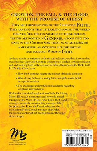 Can the biblical account of Jesus Christ and His Cross be separated from the Old Testament book of Genesis? In The Big Three, Dr. Henry Morris III explores the Creation, the Fall, and the Flood revealing the scarlet thread tying them to the gospel message of Jesus.Global acceptance of the scientific theory of evolution has diminished even Christianity's opinion of the book of Genesis as a literal account of ancient world history and a supernatural Creator. As these attacks on scriptural authority and relevance escalate, man's theories have begun to supersede Scripture. Dr. Morris writes to awaken the Church to the devastating effects of teaching these foundational messages of the Bible as allegory.In this remarkable Bible study reference, you will uncover: How the Scriptures negate the concept of theistic evolution Why a living faith and a saving faith exemplify a solid belief in a literal sixday creation Why God has placed such an emphasis on His creative power and work. The challenges and confusion in academia regarding scriptural interpretationIn order for the gospel message to be understood in its fullness, the significance of the creation message must be properly set as the foundational doctrinal floor upon which the rest of the Bible's message depends. The Big Three is a critical study for all pastors, Bible teachers, and individuals who seek to know God through His Word.